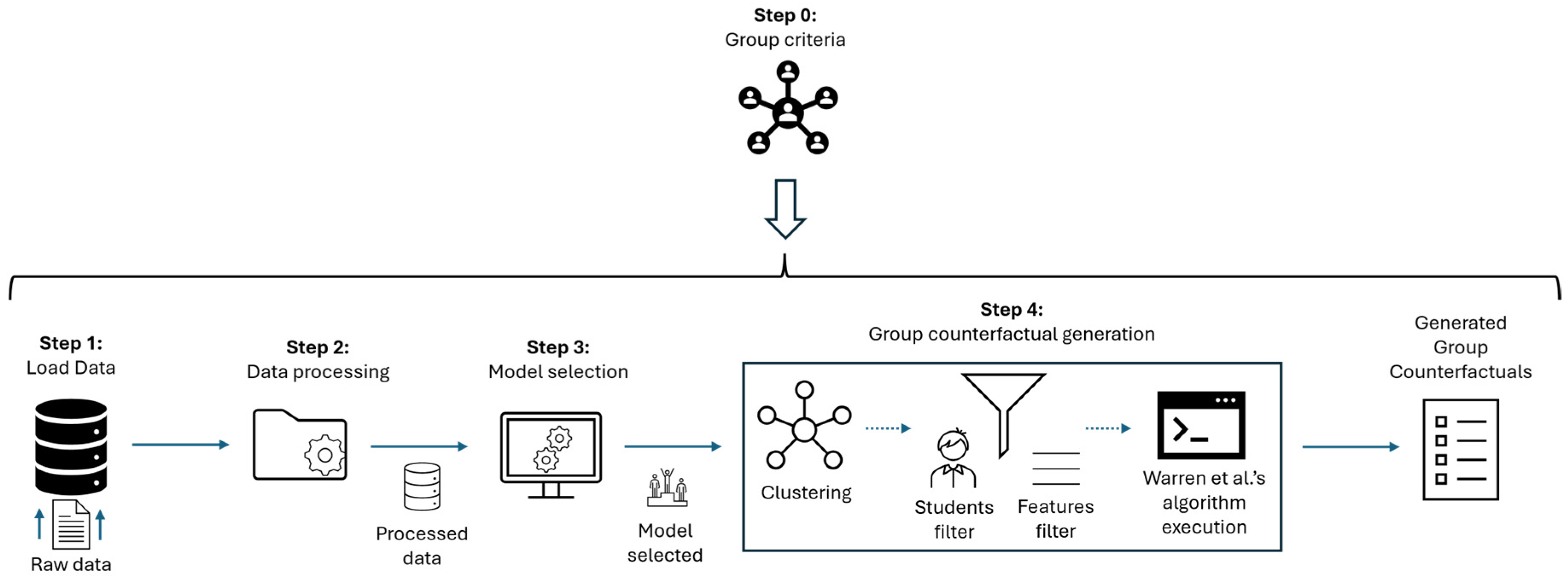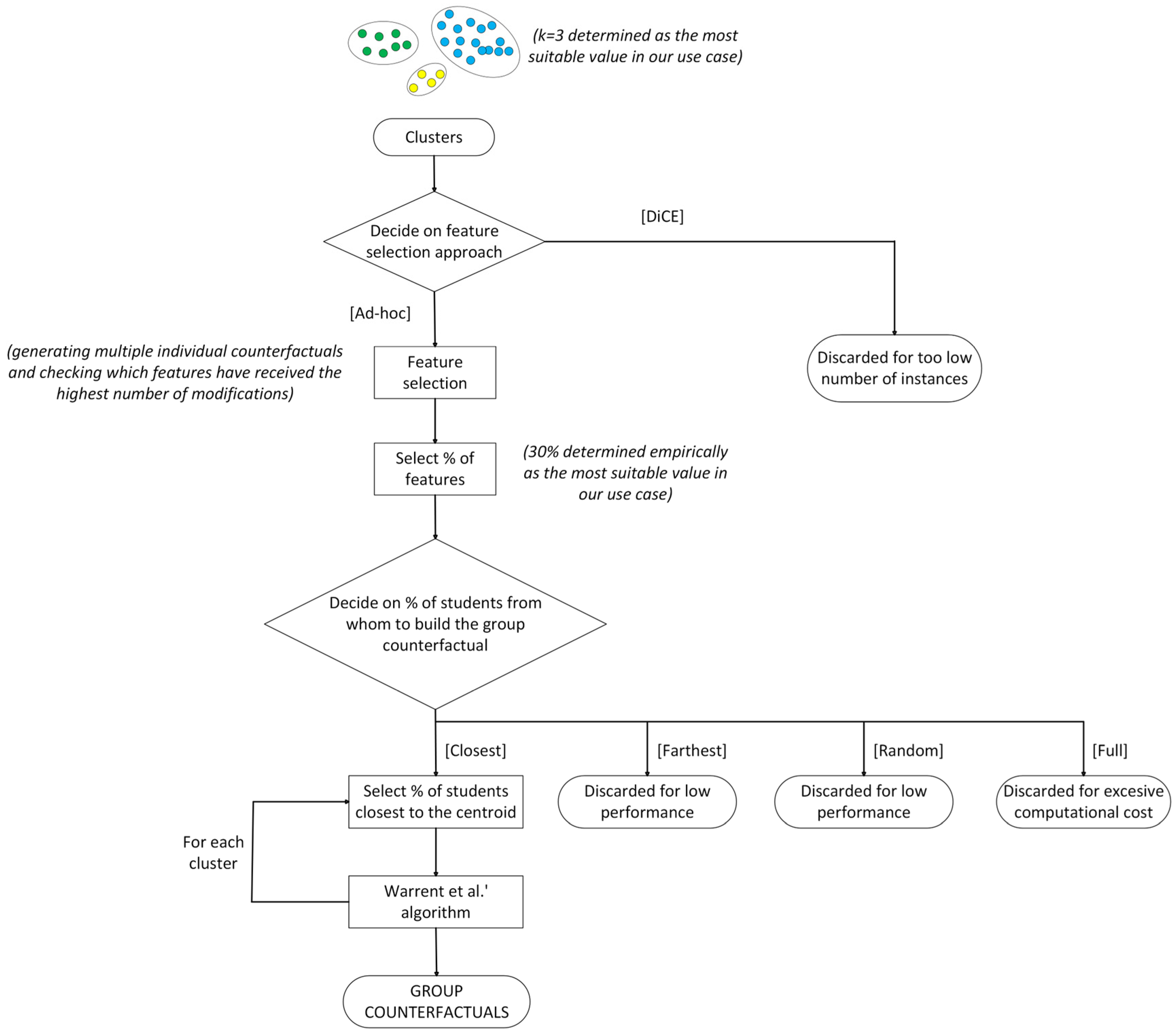 | Input: RD //Raw dataset Output: GC //Group counterfactuals 1: Load(RD) //Load data onto the pipeline 2: PD ← Data_Processing(RD) //PD denotes processed data 3: BM ← Model_Selection(PD) //BM denotes best model 4: C = {Ci} ← Clustering(PD), I = 1..k //Ci denotes each of the obtained clusters; k = n. clusters 5: Determine %f and %st //% of features and students to be considered 6: Determine m //m is the most suitable method of selecting students 7: For each i 8: C’i ← Subset(PD,Ci,%st,m) //We select only %st of students 9: GCi ← Warren_Alg(PD,BM,C’i,%f) //See [5] for all details of Warren et al.’s algorithm 10: Return GC = {GCi}, I = 1..k |