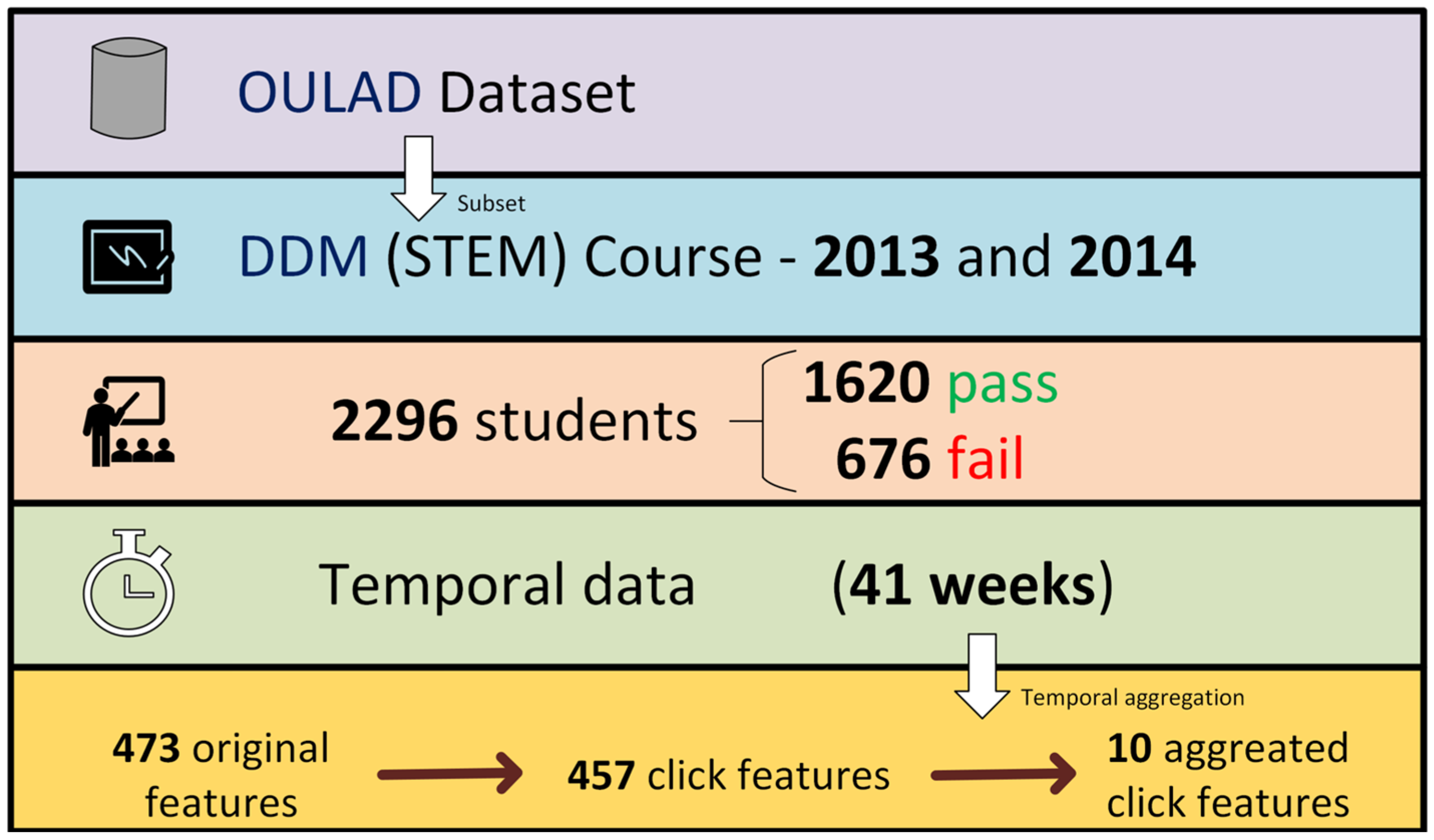 - Kuzilek, J.; Hlosta, M.; Zdrahal, Z. Open University Learning Analytics Dataset. Sci. Data 2017, 4, 170171. [Google Scholar] [CrossRef] [PubMed]