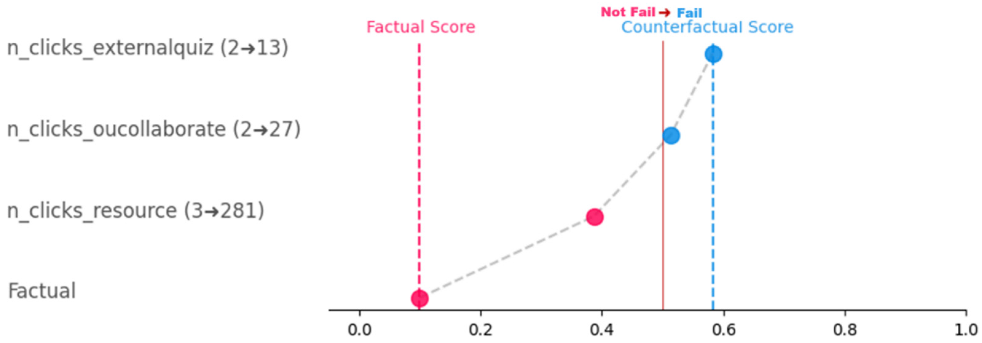 - The counterfactual for cluster 0 indicates that it would be useful for students of this type (those who failed, having very low interaction levels) to have more clicks (higher activity) on three types of resources: external quizzes, collaboration (although not explicitly explained in the dataset, we presume that these are clicks on collaborative tasks), and resources—see all details in [38].