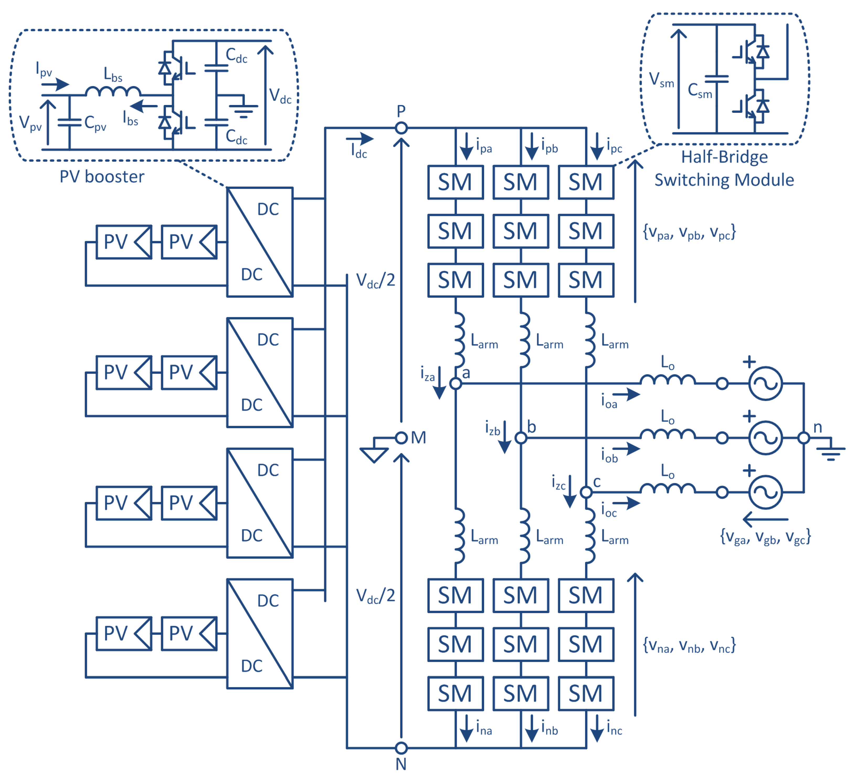 36]: on an MMC, for example, all the cells of the three phases should receive PWM signals, so not only should the duty cycles of the vectors be found, but also the duty cycles of the PWM generators.