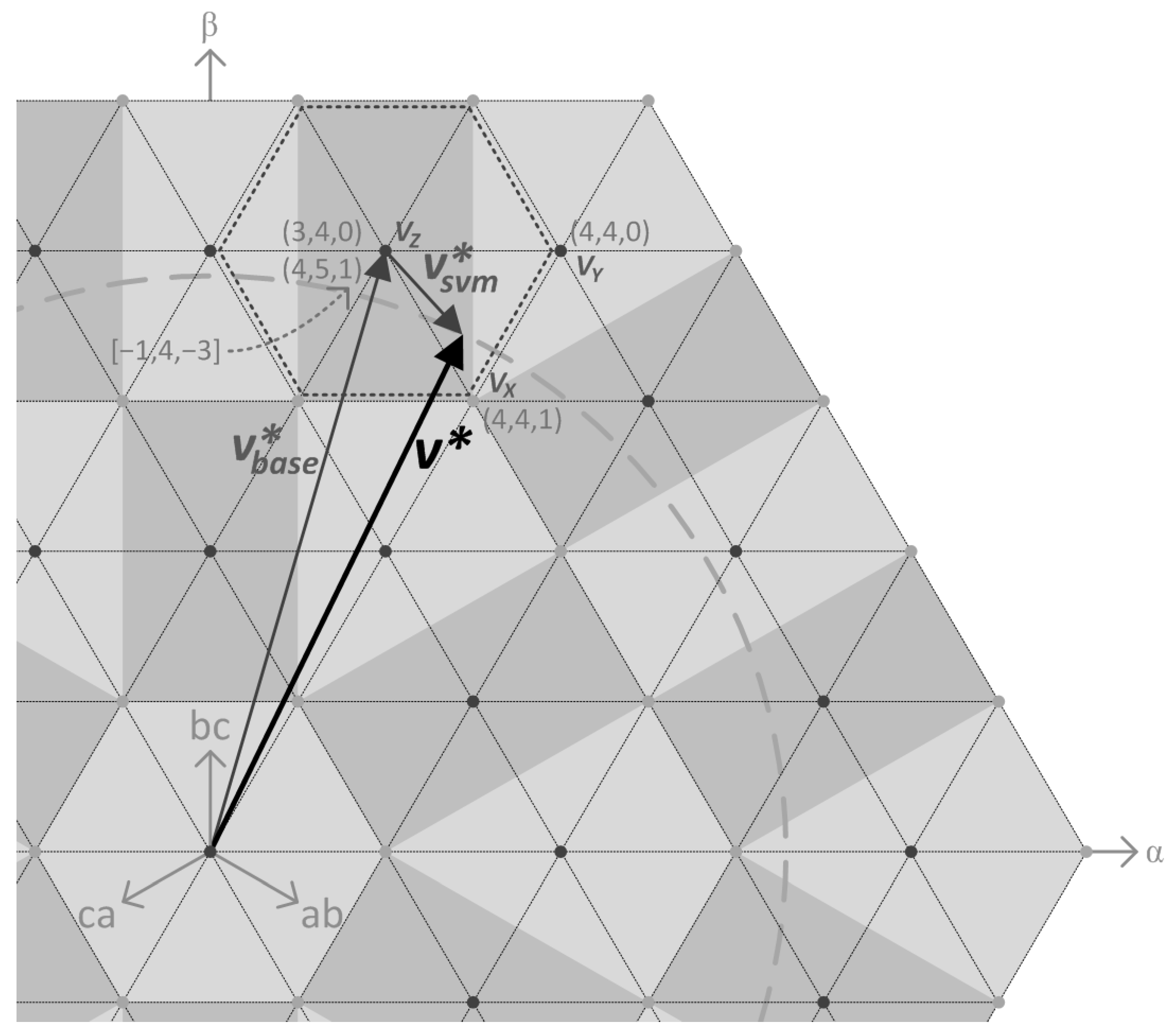 45], a similar method is suggested using a fractal strategy: through the use of a repeated triangularization process, they advance until the triangle containing the reference is identified; however, as the number of levels grows, this fractal scheme may become increasingly complex. Whenever the decomposition process is made simple or complex, the target is clear: finding integer numbers that will lead to a decision, that in the case of an MMC it means determining how many converter cells will be 100% active during each sampling period, and computing the duty cycles of the last cells of each arm using a two-level SVM (a method that is well known and is considered easy).