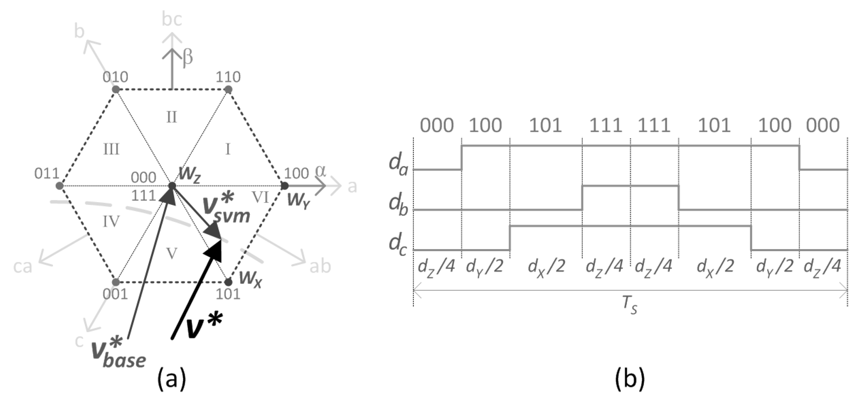 34] is probably the most used and is the base for many other procedures as it provides a very simple and fast method to find the switching vectors and their duty cycles. It uses two axes,