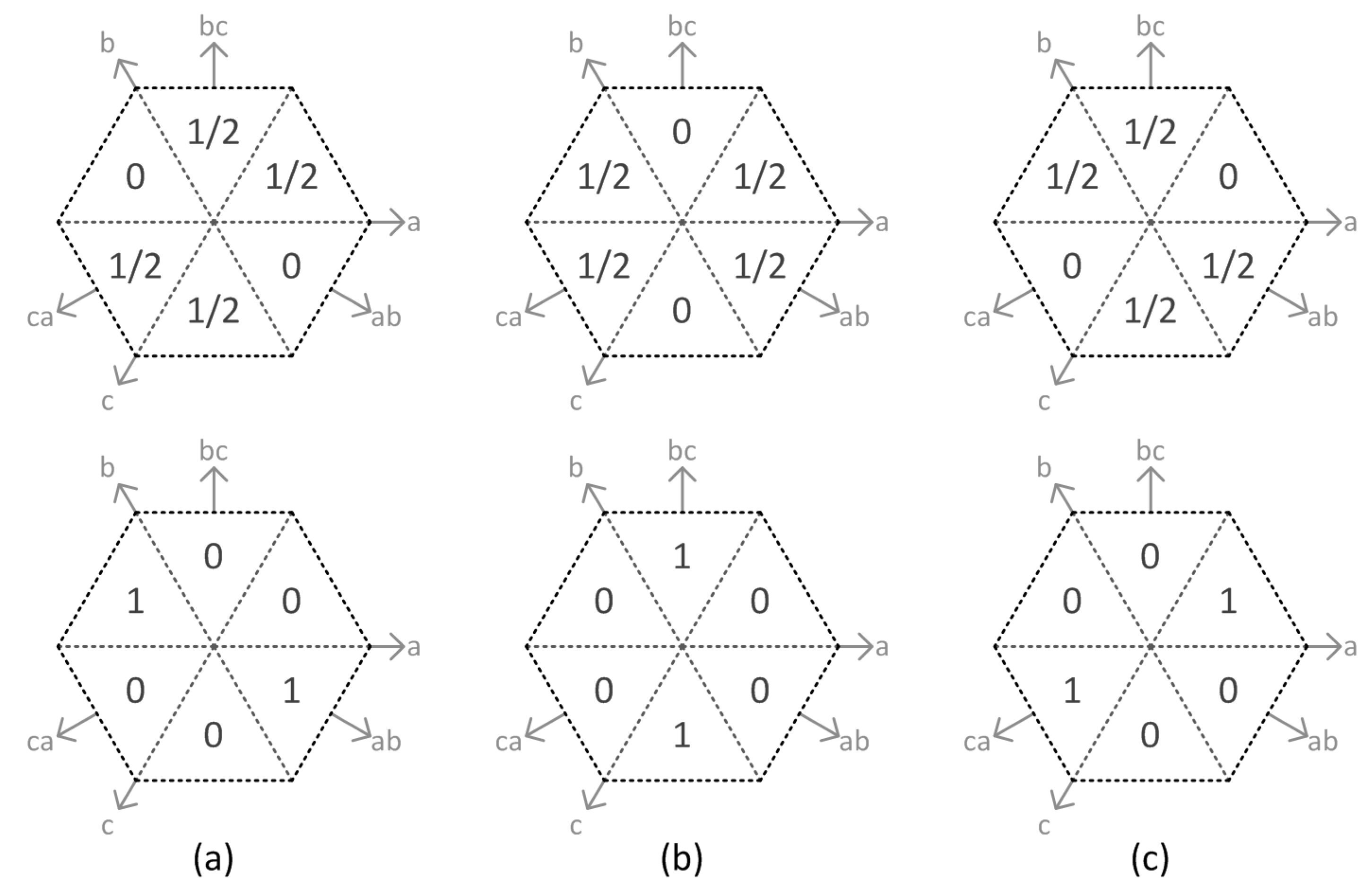 c, with a behavior similar to the line voltages; three integer coordinates were found for each reference, and their summation decides if the reference is located on a triangle type 1 or type 2—an idea previously given by [