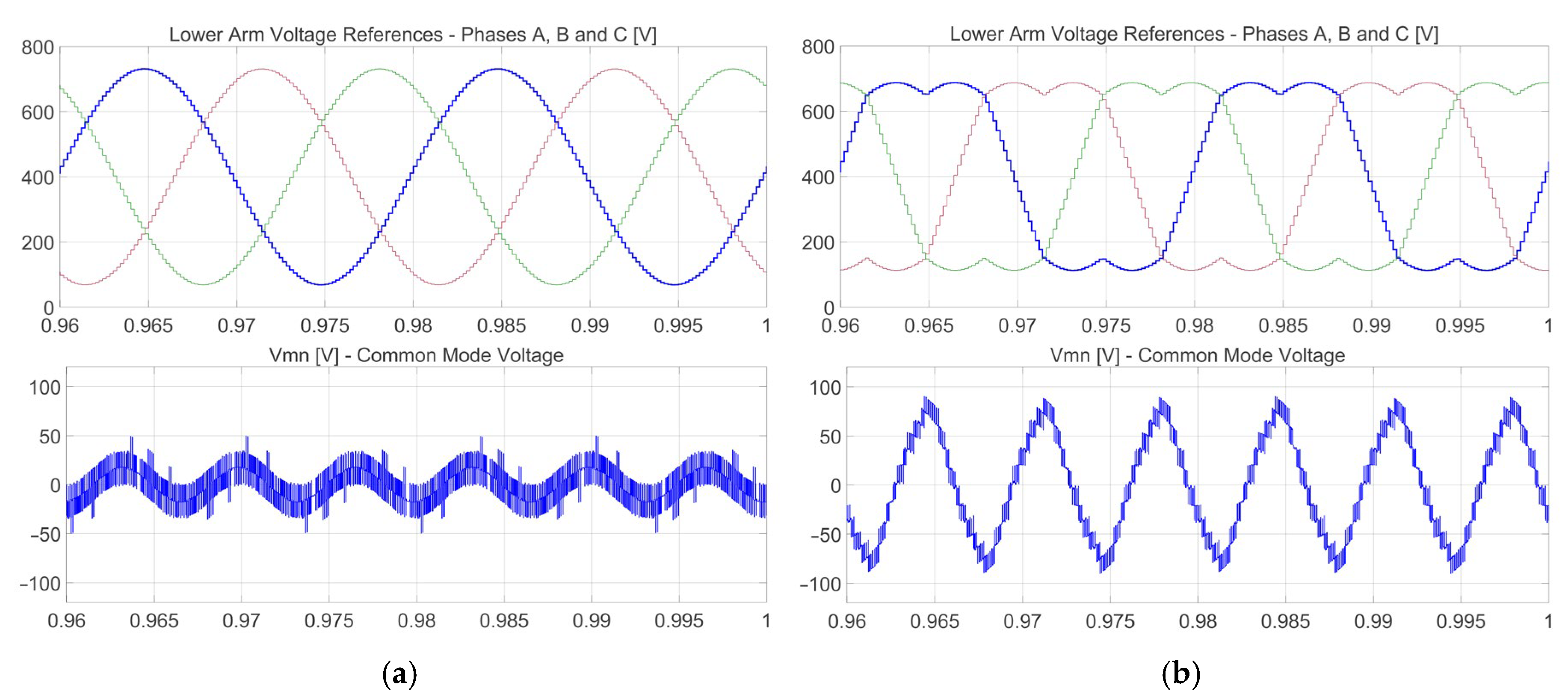 Section 3 can be used to find the duty cycles for the last three PWM generators (one per phase). The generated CMV using those equations is quite correct, but it has an undesirable ripple, as shown later.