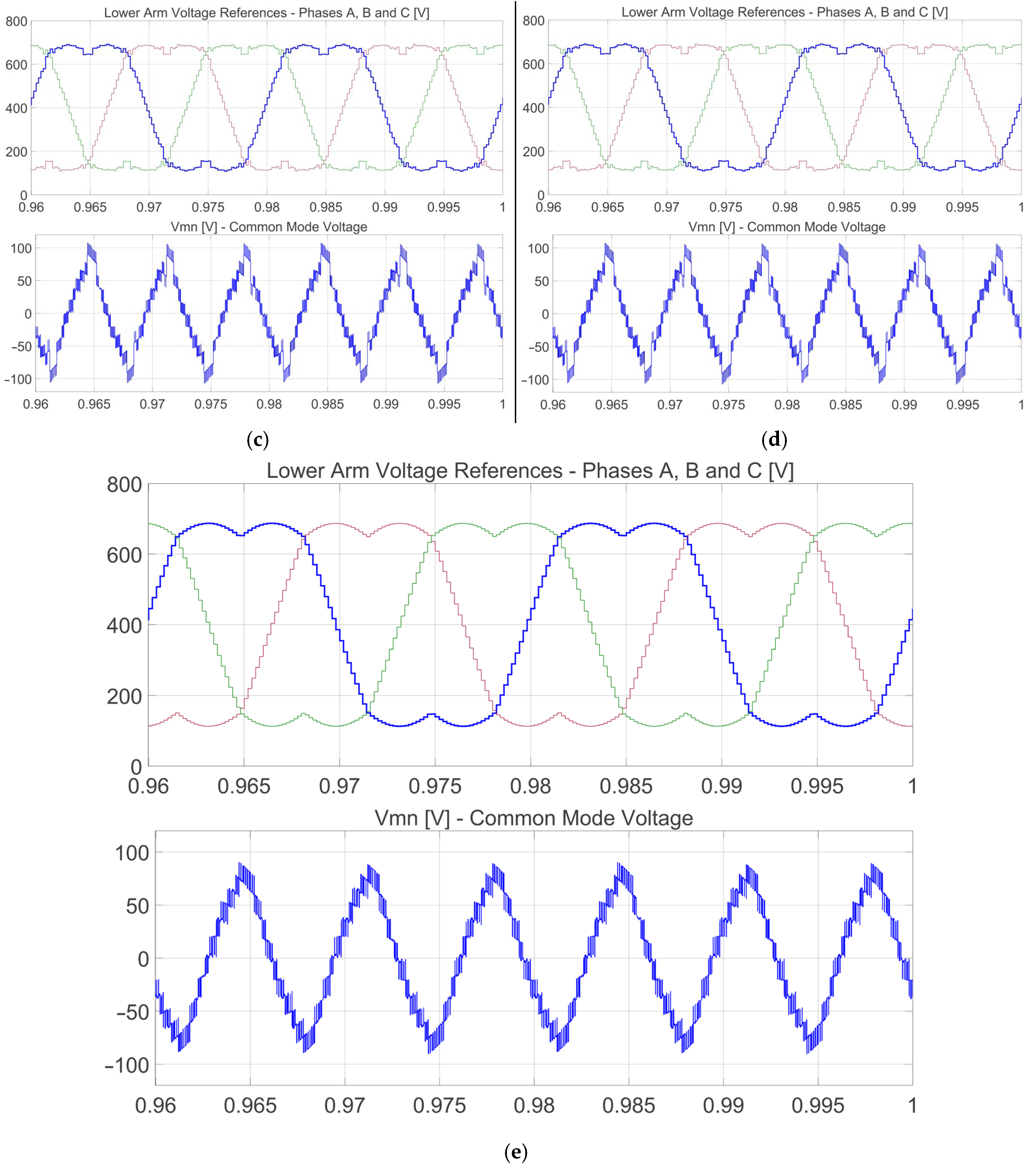 Section 5, the duty cycles previously found are modified by targeting a different behavior on the CMV, i.e., by actually targeting the same CMV generated by PWM with a zero sequence injection (ZSI-PWM), which is when half of the median of the three phase-to-neutral references are added to the three references.