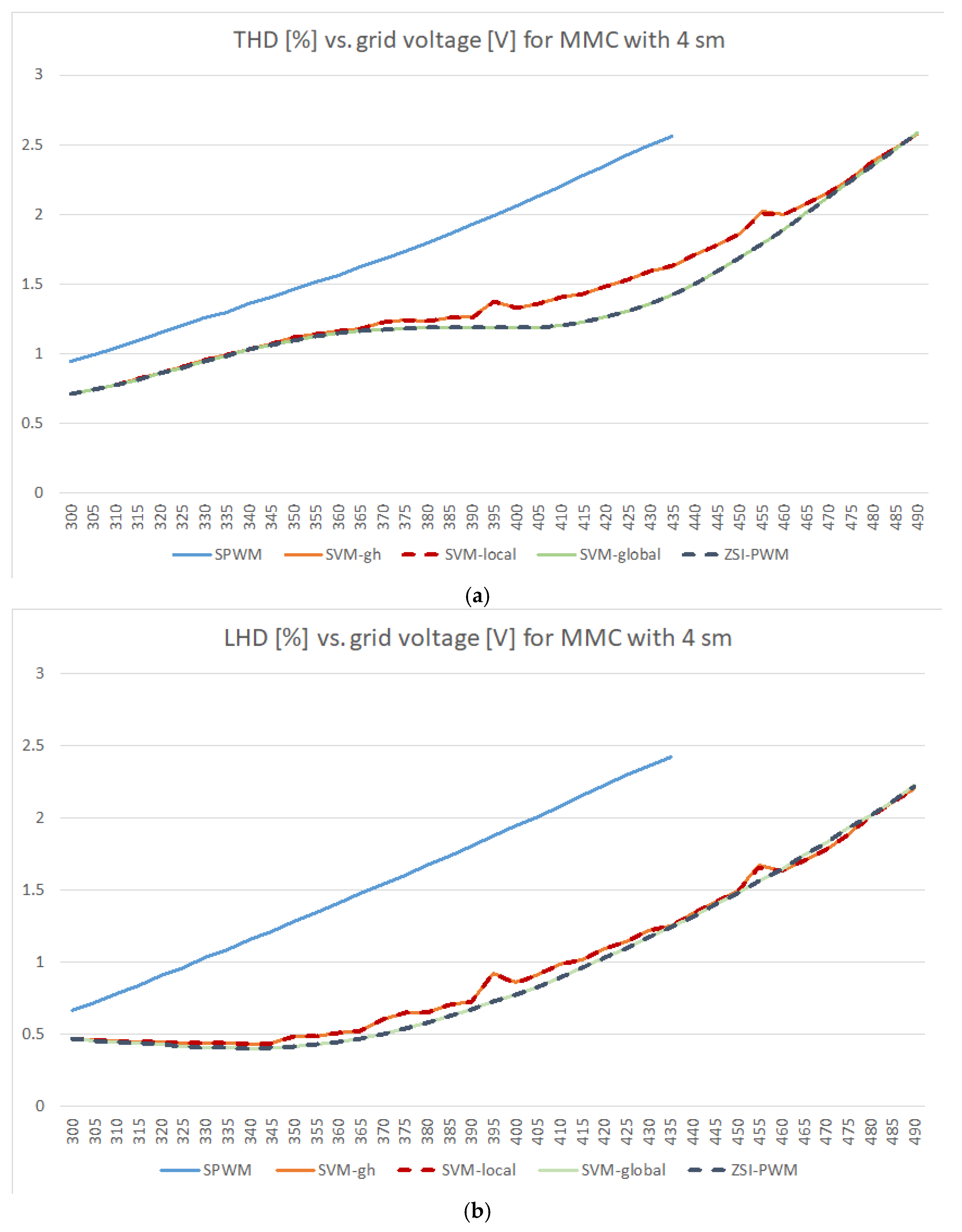 Section 7, it was analytically demonstrated that their control signals should be equal in any situation for multilevel converters with any number of levels. However, when measuring the execution time on the RTS, it was found that the implementation of SVM-global and ZSI-PWM was not only regular and easy in both cases, but they also needed about the same number of instructions, which was actually less in the case of ZSI-PWM. The observed more consistent distortion for different grid voltages when using global orientations, compared to the method with local orientations or any other method using only local information, would be a good reason to introduce this idea in the development of future SVM methods.