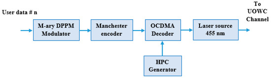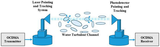 Figure 1 show the general block diagram of the FSO-CDMA system underwater [1]. This system consists of an OCDMA transmitter, laser pointing and tracking system, FSO underwater communication channel, photodetector pointing and tracking system, and OCDMA receiver. In the OCDMA transmitter shown in Figure 2, the data is firstly modulated using differential pulse position modulator to minimize the pulse width and reduce the channel dispersion. This DPPM signal is encoded using a Manchester line encoder to improve the signal properties. Before transmission the encoded data is encoded again using a CDMA HPC encoder to spread the data, prevent the MAI, and ensure system security. The laser source used operated at the 455 nm wavelength of the blue light to minimize the signal attenuation through the FSO channel underwater [2,3,4,5,6,7,8,9,10]. The pointing and tracking systems are used to achieve line of sight (LOS) communication between the transmitter and receiver. Pointing–tracking assumptions include using a closed-loop control system to correct errors and using a beacon or celestial images for calibration. The signal-to-noise ratio (SNR) is a primary factor in determining the precision of pointing errors. Pointing errors reduce the SNR, which in turn decreases the system’s effective range and increases the bit error rate (BER), especially at higher bit rates. The effect of both the incident angle and pointing jitter is typically a reduction in the received signal power, which decreases SNR, limits maximum range, and increases BER.