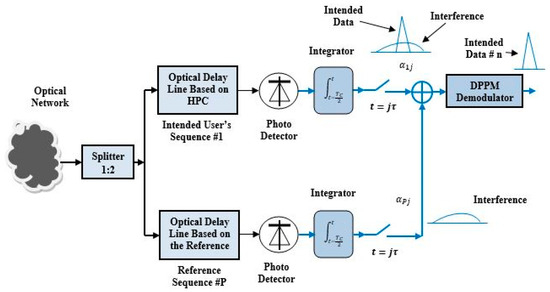 Figure 3 illustrates the MAIC receiver. In this figure, the HPC sequence of data #n incoming from the optical network is decoded using the optical delay lines and the optical received signal is converted to an electrical one using the p-type intrinsic n-type semiconductor (PIN) photodetector. The output electrical signal from the photodetector is typically integrated, sampled over the half-pulse duration due to the use of the Manchester line encoding technique, and demodulated by the DPPM demodulator to extract the intended data signal #n, where the incoming signal from the optical network passes through two decoding branches. The upper branch decoder is the desired optical decoder used to decode the HPC sequence of user #n, while the lower branch decoder is used as a reference decoder to decode only interference and noise. Finally, the output of the lower decoder has been subtracted from the output of the upper decoder to extract the desired signal from the interference and noise. After that, the DPPM demodulator is utilized to extract the original transmitted signal of user #n from the DPPM signal.