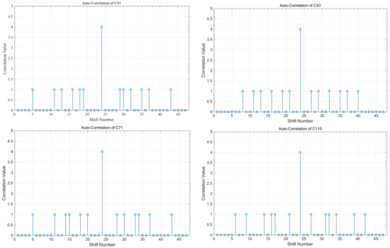 Figure 4 shows the simulation results for the auto-correlation values of different HPC sequences such as , , , and . These results show that at the sampling time, the peak auto-correlation value equals 4 for each code sequence. This is because each code sequence consists of four ONEs that represent the code weight and prove Equation (1). Also, the side lobe values do not exceed 1; this helps the receiver to make the good decision to extract the data from the received data, which contain the data and interference and consequently enhance the system’s BER performance.