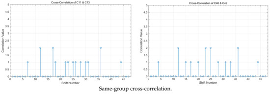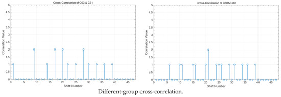 Figure 5 illustrates the cross-correlation values between different code sequences, focusing on both sequences within the same group and those from different groups. It is evident that when two code sequences belong to the same group, the cross-correlation value is “ZERO” at each synchronized time corresponding to the shift number “24,” demonstrating perfect orthogonality and resulting in zero interference on the receiver side. Additionally, the simulation results show that when comparing code sequences from different groups, the cross-correlation value at the sampling time can be either “0” or “1,” highlighting the differences in interference behaviour based on group affiliation.