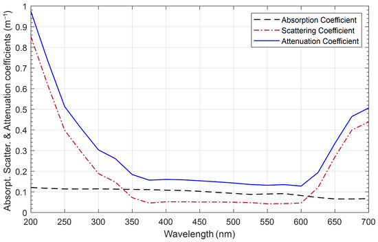 In this context, and are constants valued at 0.25 and 0.006 for pure water and 0.15 and 0.198 for clear ocean water at 455 nm, respectively. The first term denotes the attenuation length of loss, which is shorter than the diffusion length, while the second term represents the attenuation length of loss, which exceeds the diffusion length. Figure 6 displays the absorption, scattering, and attenuation coefficients for pure seawater across a wavelength range of 200 to 700 nm. The figure shows that the absorption coefficient remains relatively constant over this range, varying from 0.105 at 400 nm to 0.08 at 600 nm. Additionally, the scattering coefficient is lower within the 400 to 600 nm range, peaking around the 500 nm wavelength, and its effect is presented in [5,6]. In this study we set the scattering coefficient as equal to 0.03 for chlorophyll concentration in pure water.