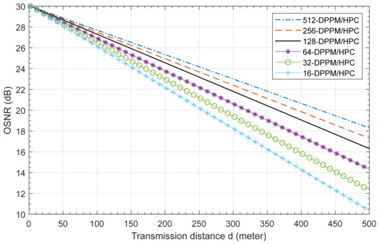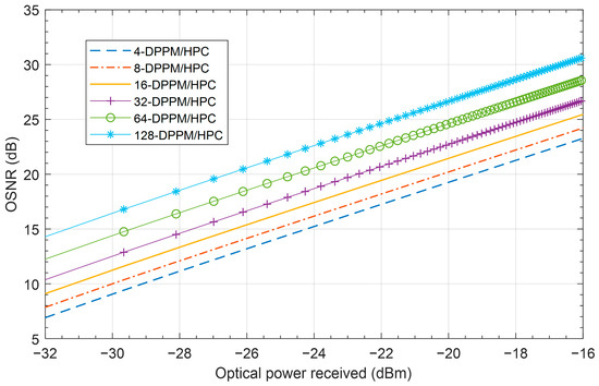 The OSNR versus the optical received power of the M-DPPM/HPC OCDMA system for different values of system multiplicity M at 455 nm is presented in Figure 8. The results for the 20 m FSO link illustrate that when the system multiplicity increases, the system OSNR increases. When the optical power received reaches −26.5 dBm the OSNR equals 20 dB for the 128-DPPM/HPC scheme compared to 14 dB for the 4-DPPM/HPC scheme; this means the OSNR improves by 6 dB when the system multiplicity increases by a factor of 32.