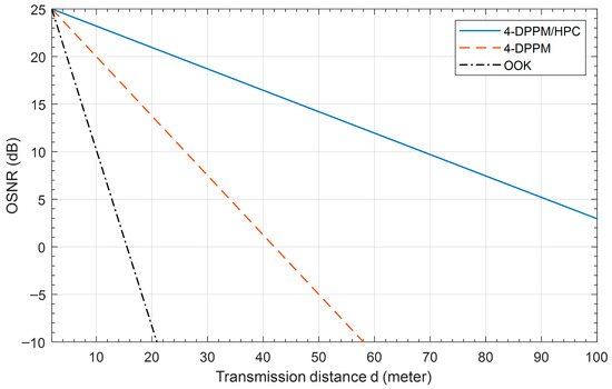 Figure 9 presents the system OSNR versus the transmission distance for OOK, 4-DPPM, and 4-DPPM/HPC coding schemes with Manchester encoding at 455 nm in pure seawater. The results show that the when the transmission distance increases, the OSNR is decreased for all coding schemes, but the 4-DPPM/HPC scheme is better than the others because the degradation slope is slower than the other schemes’ slopes. At 10 dB system OSNR, the OOK, 4-DPPM, and 4-DPPM/HPC coding schemes achieve 10 m, 26 m, and 68 m underwater FSO link transmission distance, respectively.