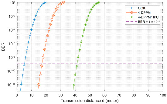 System BER performance versus the transmission distance for different modulation/coding schemes with Manchester encoding at 455 nm, P1 = 5, P2 = 7, C = 0.03, and system multiplicity M = 4.
