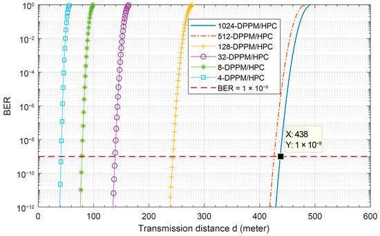 Figure 11 presents the underwater FSO-CDMA system BER performance versus the transmission distance for different modulation/coding schemes with Manchester encoding at 455 nm, P1 = 5, P2 = 7, C = 0.03, and system multiplicity M = 4. This figure shows that the system BER increases when the link transmission distance increases and the system using the 4-DPPM/HPC coding scheme outperforms the other systems due to the use of HPC increasing the optical power received and enhancing the system OSNR. At 10−9 system BER, the OOK helps the system to communicate over 5 m, the distance increases to 17 m when the 4-DPPM scheme is used, and the hybrid 4-DPPM/HPC coding scheme helps the system to communicate over 42 m under the pure seawater FSO channel. When the system multiplicity increases, the BER decreases, as shown in Figure 12. But at the higher values of system multiplicity, the system BER performance variation decreased compared to the lower multiplicity values. Furthermore, at a BER equal to 10−9, the system that uses 1024 and 512 multiplicities can communicate over 438 m and 430 m, respectively, compared to 250 m and 140 m when the 128 and 32 system multiplicities are used. This is due to the degradation of the system, stopping it from making the true decision at the receiver side.