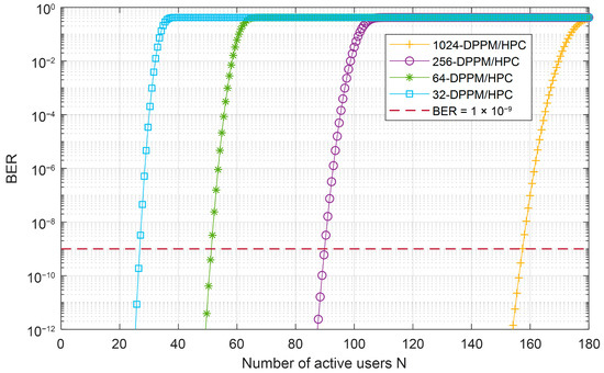Figure 13 investigates the effect of the M-DPPM/HPC scheme on FSO-CDMA system BER performance versus the number of active users over a 438 m underwater channel at 455 nm. The results show that for any value for system multiplicity, when the number of users increases, the BER performance also increases. This is depending on the amount of MAI caused in the multiple-access channel and the amount of interference cancelled by the MAIC receiver. On the other hand, the system of higher multiplicity can accommodate a number of active users higher than the systems of lower multiplicities. Moreover, when BER equals 10−9, the system of 1024 multiplicity can accommodate 156 users simultaneously, which uses 156 sequences out of 160 available sequences. Compared to the system with a multiplicity of 32, the system can accommodate 26 simultaneously.