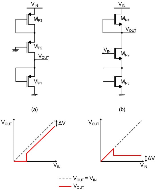 Schematic representation of the (a) PMOS-based and (b) NMOS-based voltage monitoring circuits with an additional diode-connected transistor.