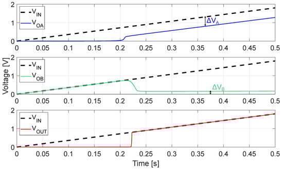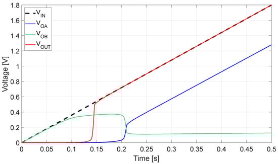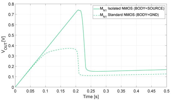 The illustrated operation description is valid provided that, in addition to the PMOS devices, transistor also does not suffer from a body effect, and it is therefore implemented through a triple-well device. If instead a standard NMOS device is used, the flat shape shown in Figure 6 and found at affects the sequential operation: indeed, without the sharp shape, there is no longer a clear discrimination at the NMOS stage output between the cases when is below or above the trigger voltage. This results in a lower trigger voltage at the overall voltage monitoring circuit’s output. In order to increase the trigger voltage, the aspect ratio of should be increased, the ratio of should be decreased, and/or the number of diode-connected transistors should be increased. Also, increasing the stand-alone trigger voltage of the last stage, and thus increasing (decreasing) the aspect ratio of (), can help. Intervening in the first stage, instead, is not useful, as changing its trigger voltage has no significant effect on the resulting flat shape. Employing isolated (triple-well) NMOS devices, when possible, is therefore clearly preferable. Alternatively, it is possible to implement the proposed circuit only with standard devices, but at the cost of increasing the area occupation. The simulated voltage waveforms found at the various nodes of the proposed voltage monitoring circuit when employing a standard NMOS device for are shown in Figure 8. It is evident that, by maintaining the same transistor size when employing only standard devices, a lower trigger voltage is determined with respect to the case when a triple-well device is used for .