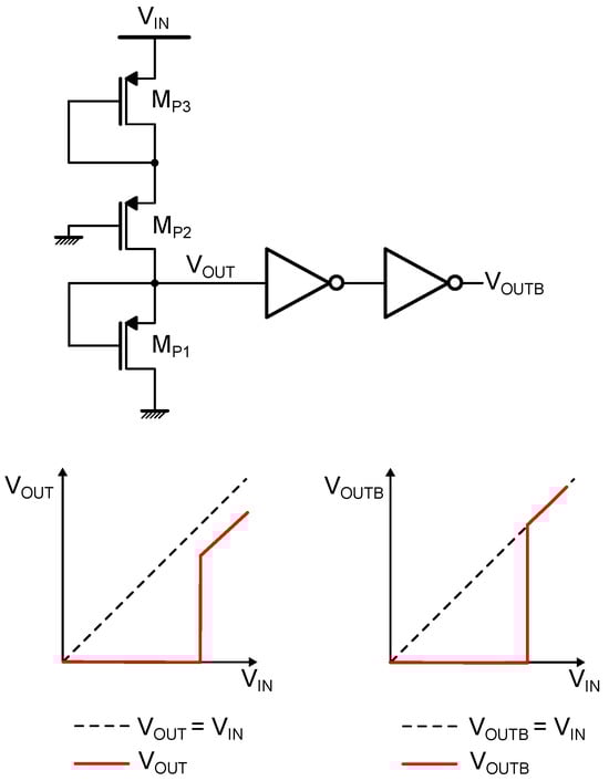 Another possibility to increase the trigger voltage is going from the 2T circuit of Figure 1 to the three-transistor (3T) structure of Figure 3 by adding a diode-connected transistor (or ), which features the same size as () [1,21]. Since and share the same size and the same current flows through them, from Equation (1), their source-to-gate voltages, and , are the same, so