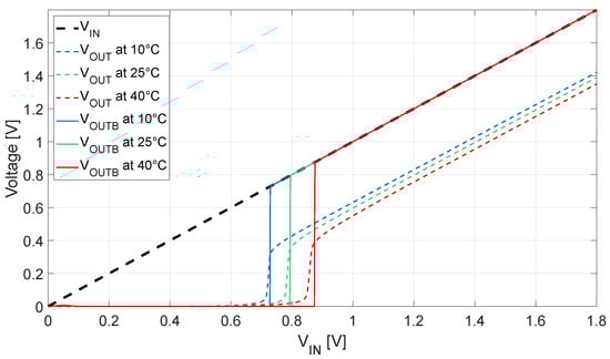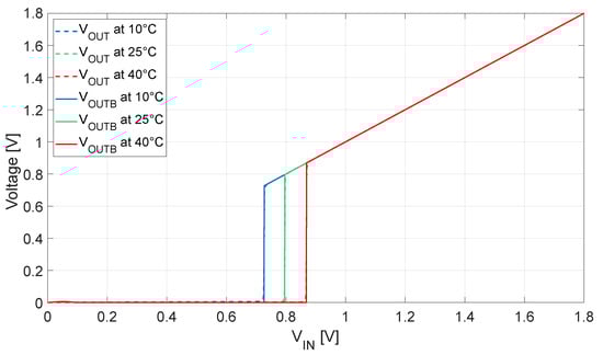 Simulated output voltages (pre- and post-inverters) as a function of the input voltage for the proposed voltage monitoring circuit in nominal conditions.