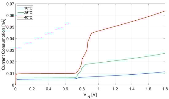 The proposed voltage monitoring output voltages and (before and after the digital buffer, respectively), under typical process conditions, as a function of the input voltage are reported in Figure 10. The current consumption, excluding the inverters as they should feature zero power consumption, as a function of , is illustrated instead in Figure 11. As expected, a difference in the trigger voltage is found at different temperatures: as the variation is ±100 mV between 10 °C and 40 °C, this is in line with the state of the art and acceptable for energy-harvesting-powered applications targeting room temperature use. It can be noticed that the current consumption, directly determined by the leakage of the transistors with zero voltage, increases with both temperature and . In order to assess the proposed and standard circuit current consumption, therefore, the case for = 1.8 V (i.e., the maximum transistor voltage rating) will be considered as it represents the worst possible case.