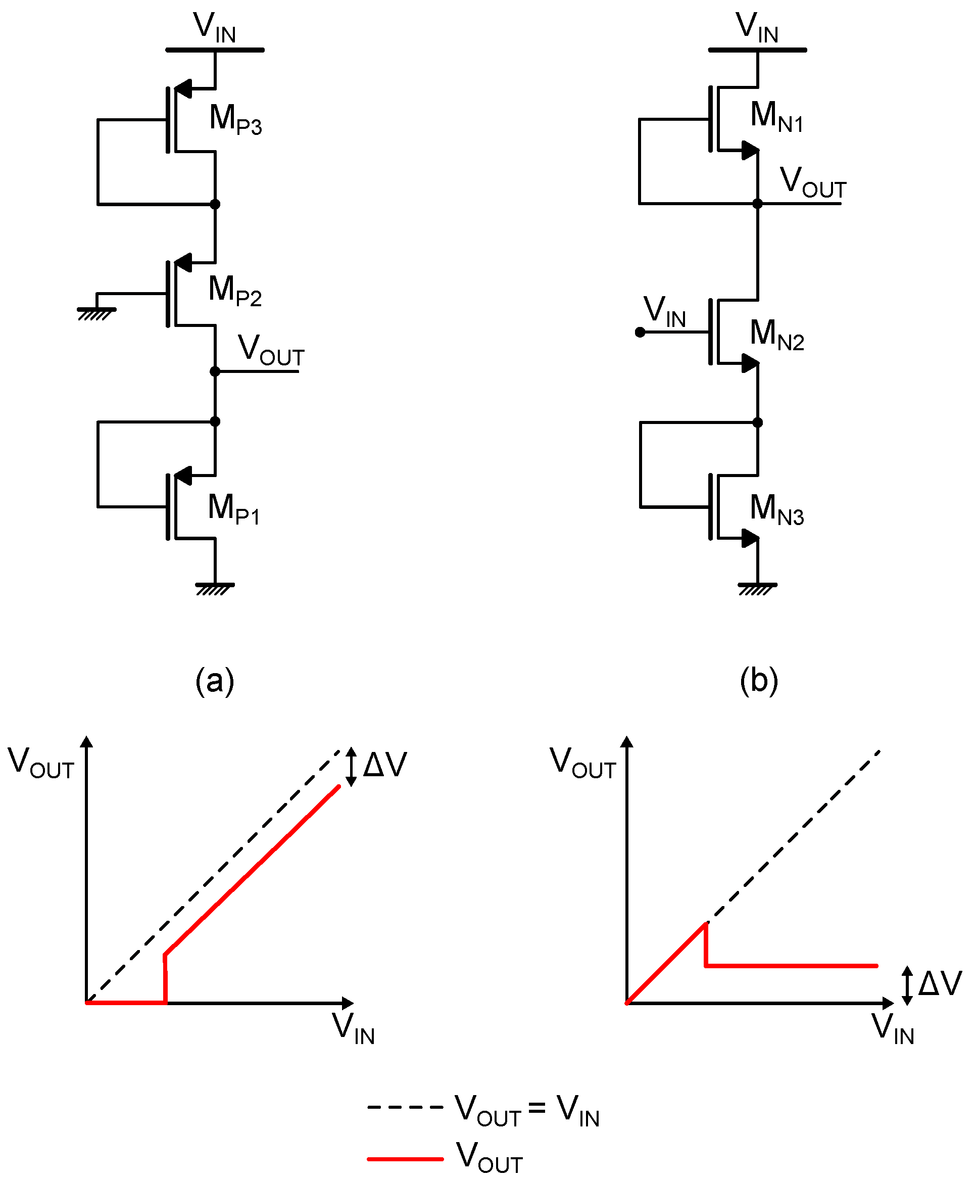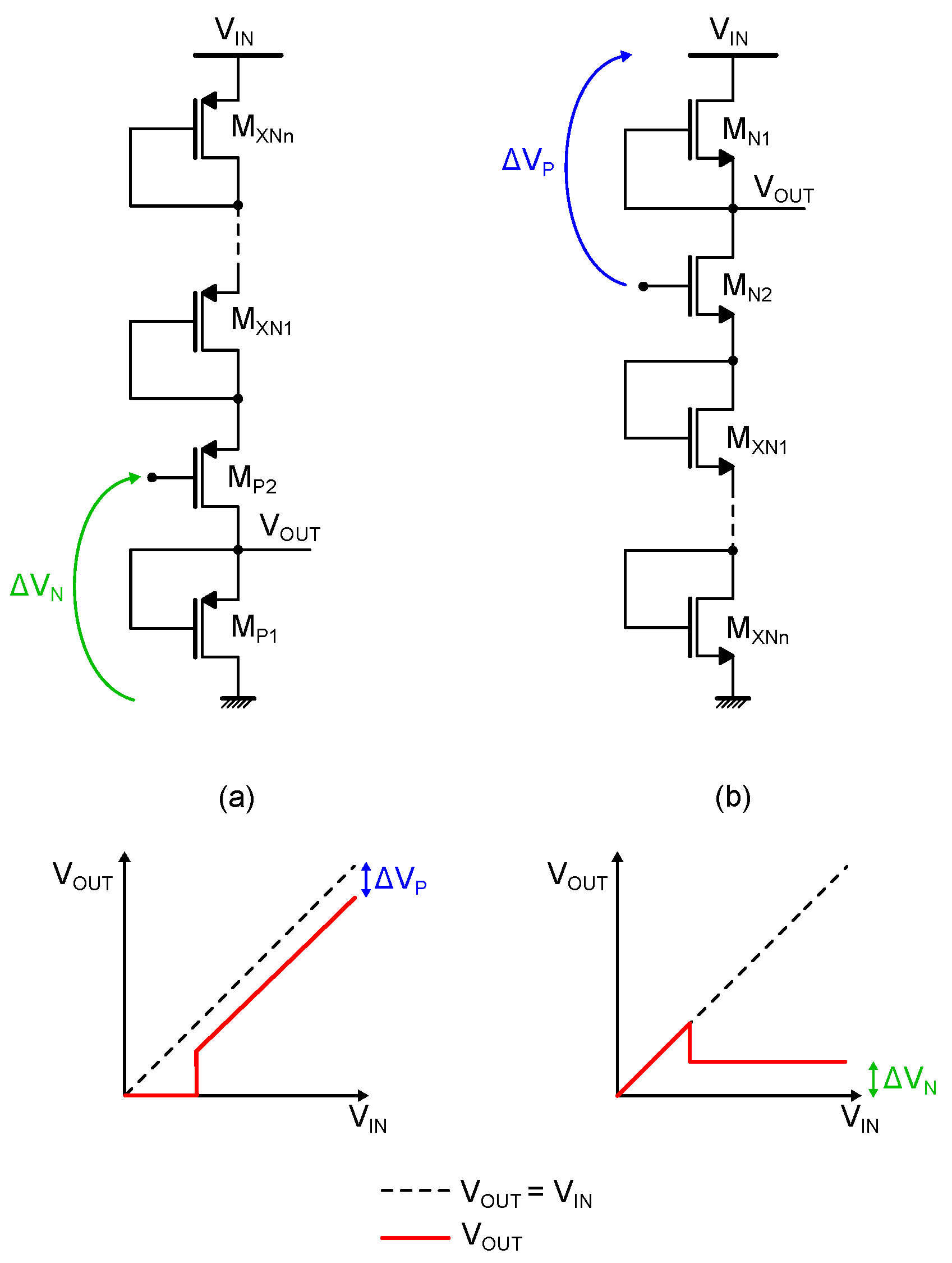 in particular, considering an NMOS or a PMOS stage, respectively) do not suffer from body effect. Ensuring that no PMOS transistor suffers from body effect is possible in any technology by shorting the transistor body and source terminals, however the same does not hold true for NMOS devices, as the process used for the implementation must support the realization of triple-wells. When