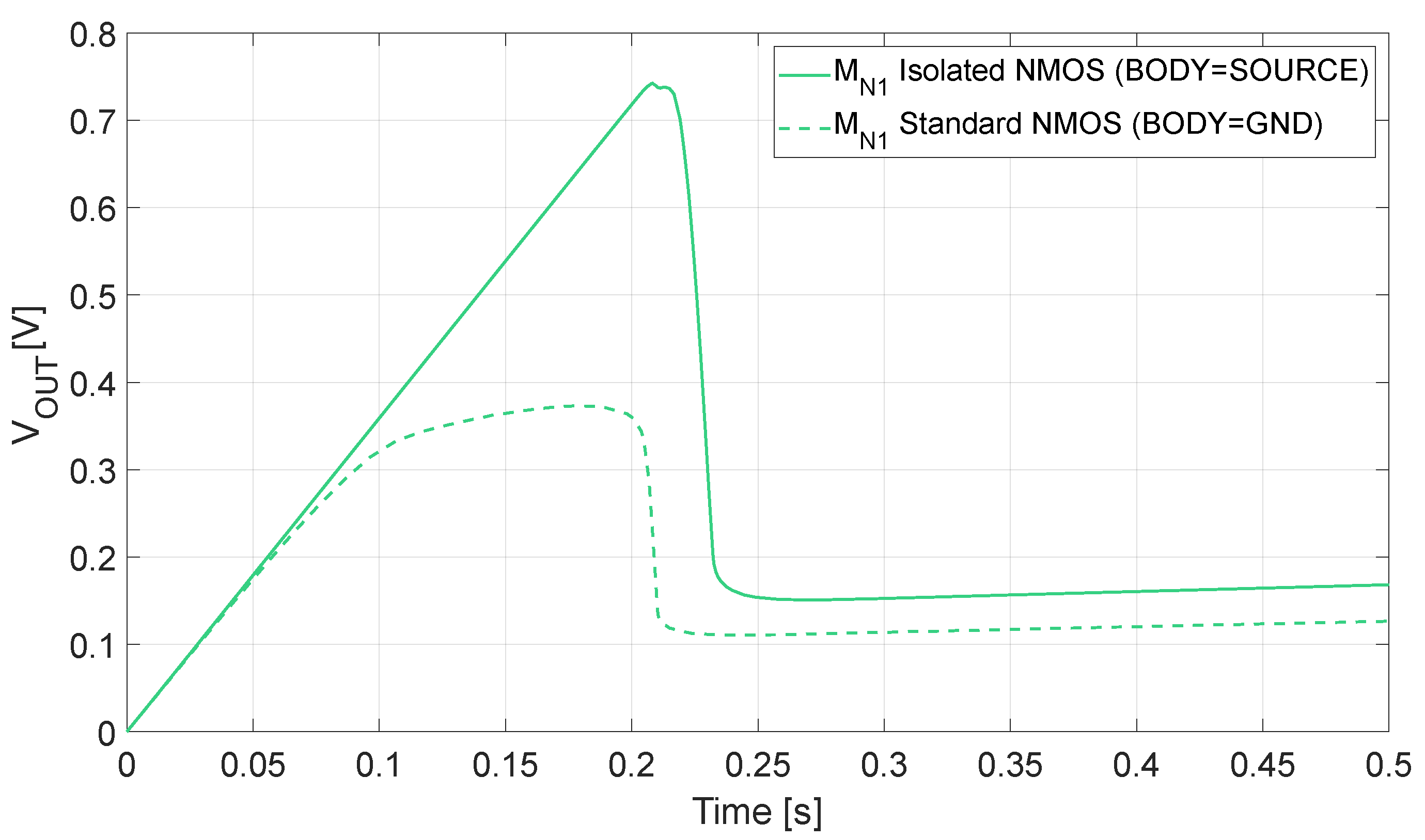 also does not suffer from a body effect, and it is therefore implemented through a triple-well device. If instead a standard NMOS device is used, the flat shape shown in