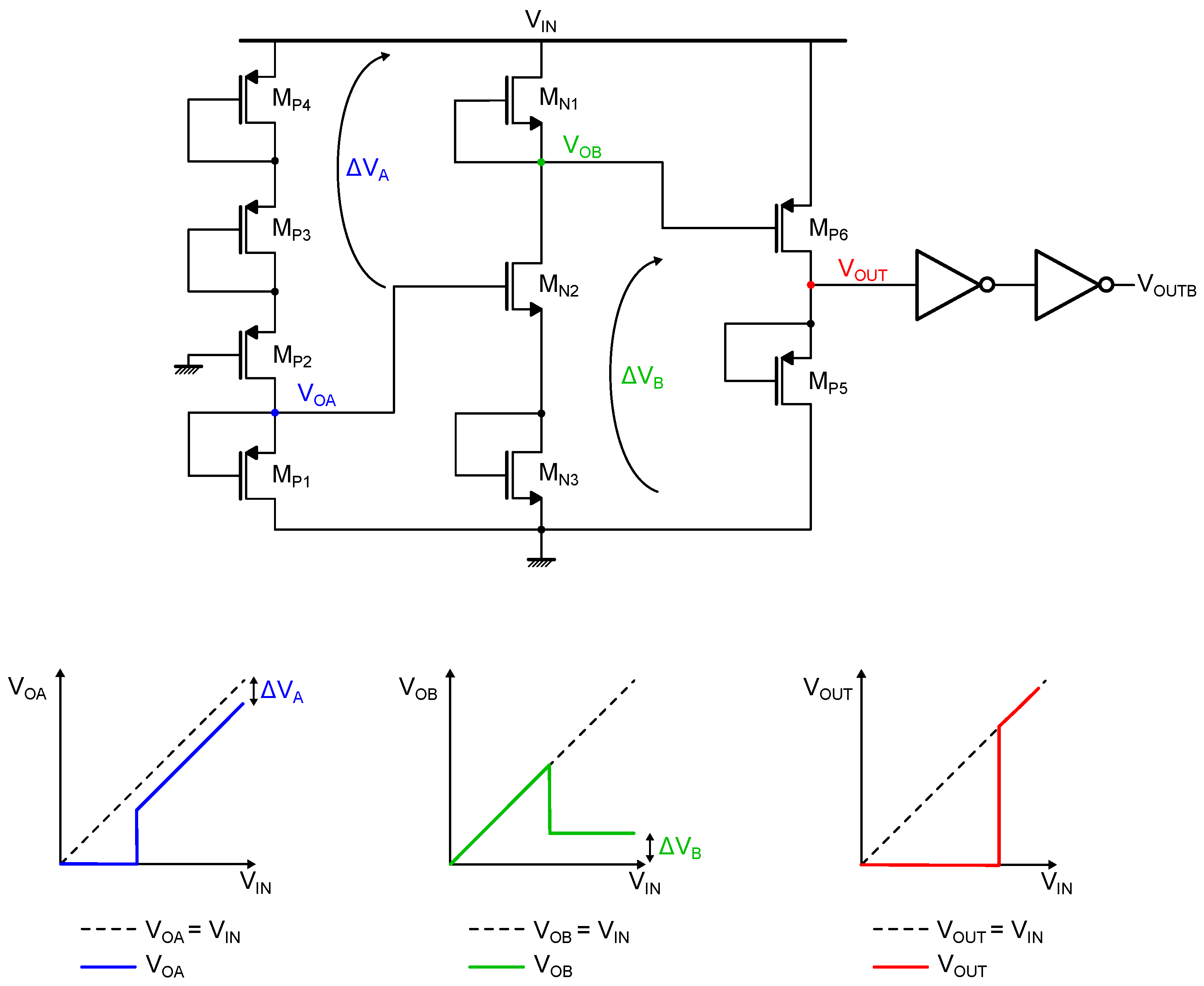The same derivations can be carried out in the case of NMOS-based voltage monitoring circuits by substituting with and with , and defining as when changes from high to low, which still corresponds to when and are equal.