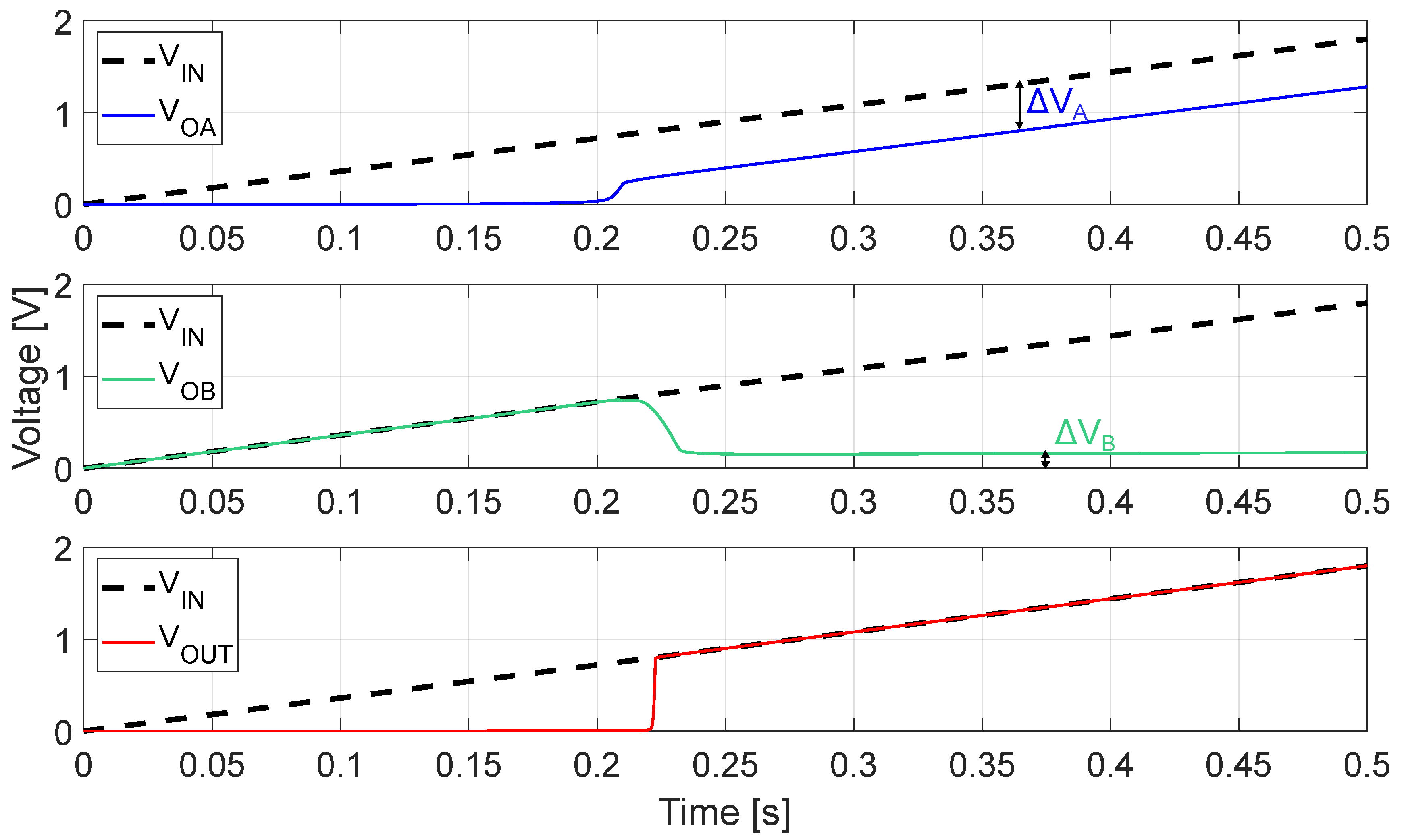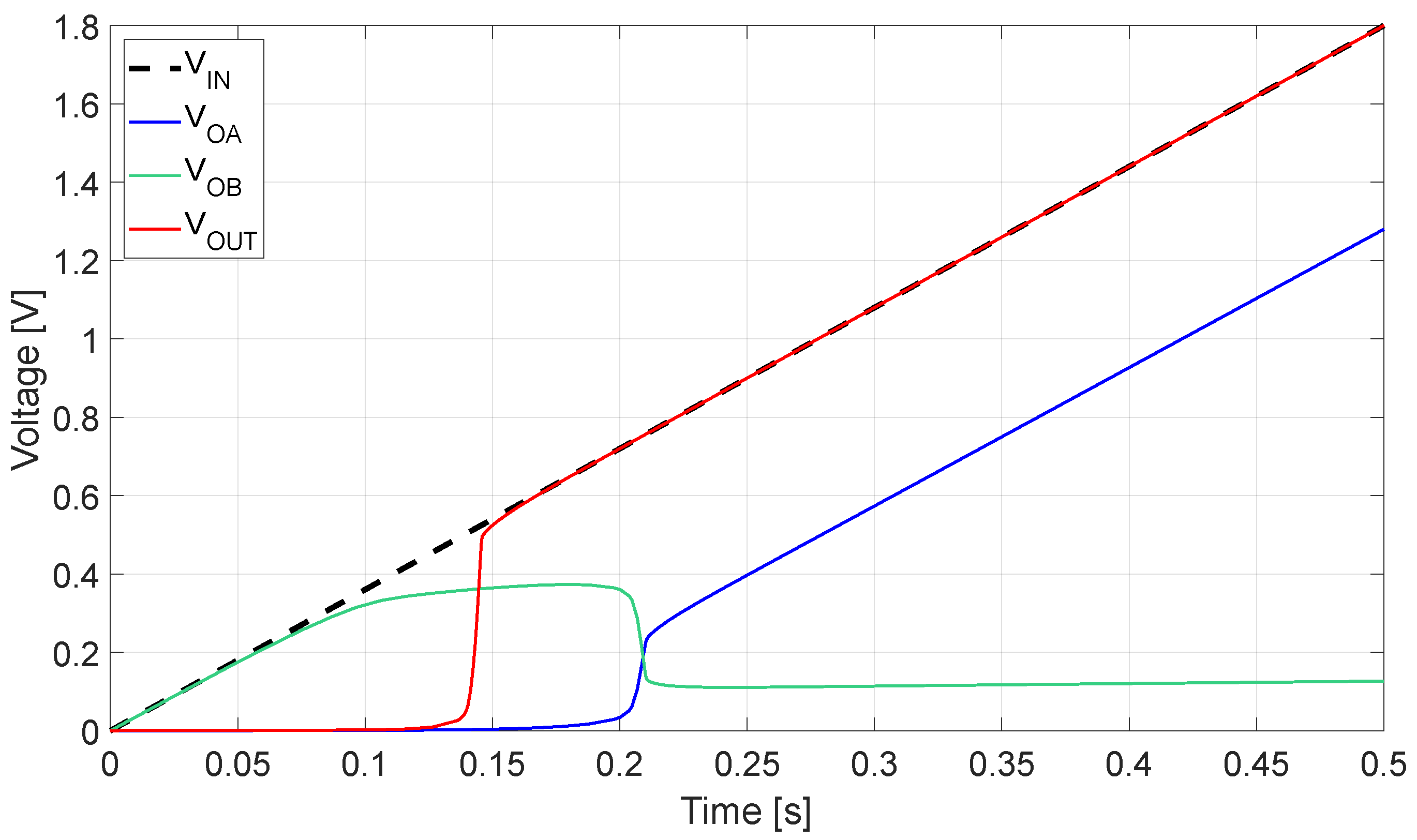 It should be noted that the response speed of voltage monitoring circuits for energy-harvesting-powered applications is not critical: indeed, the input voltage typically rises slowly (the rise time is on the order of hundreds of ms) as the charging of a large input storage capacitance is involved. Hence, when considering the evolution of the nodes with respect to time, considering a 500 ms rise time for the input voltage is reasonable.
