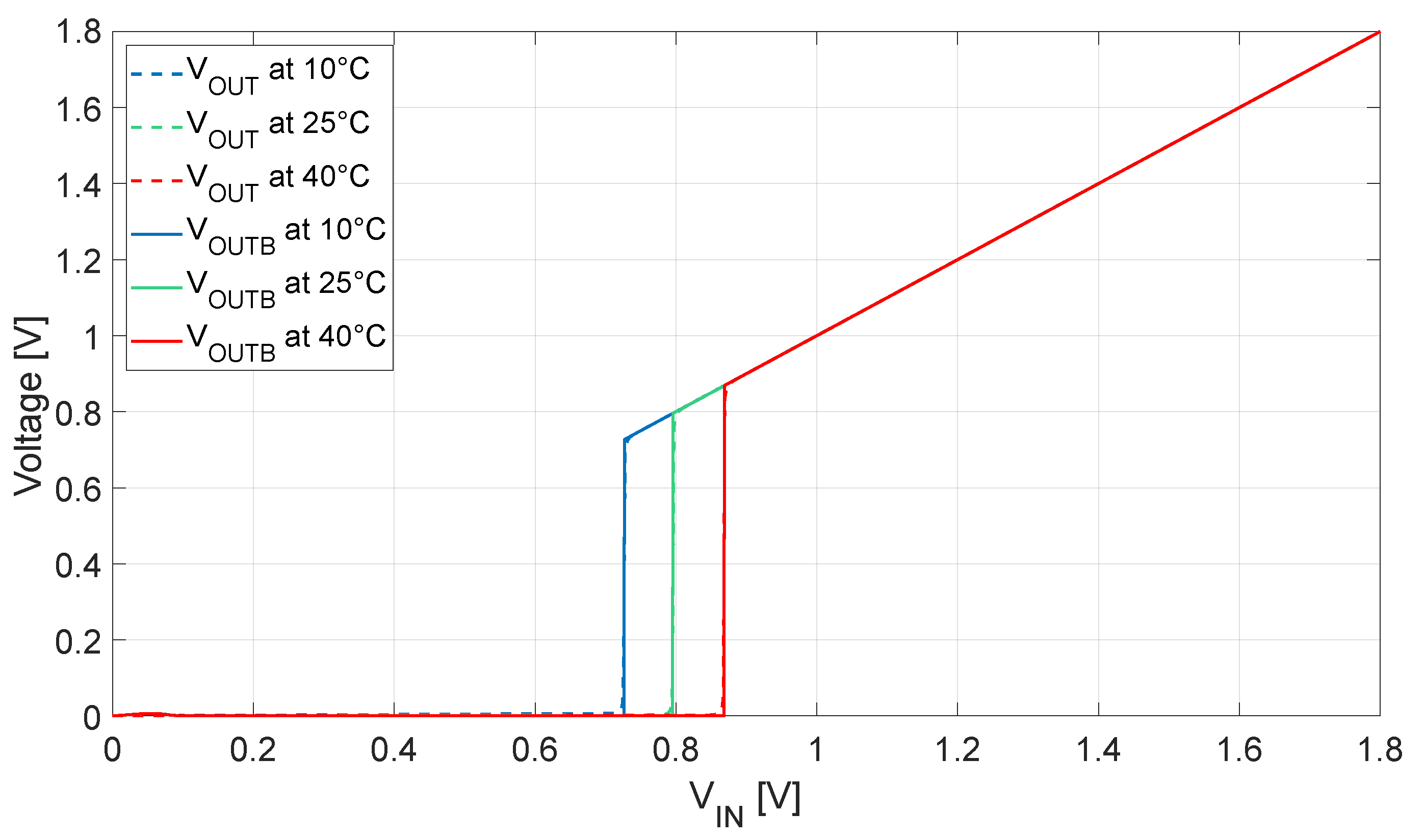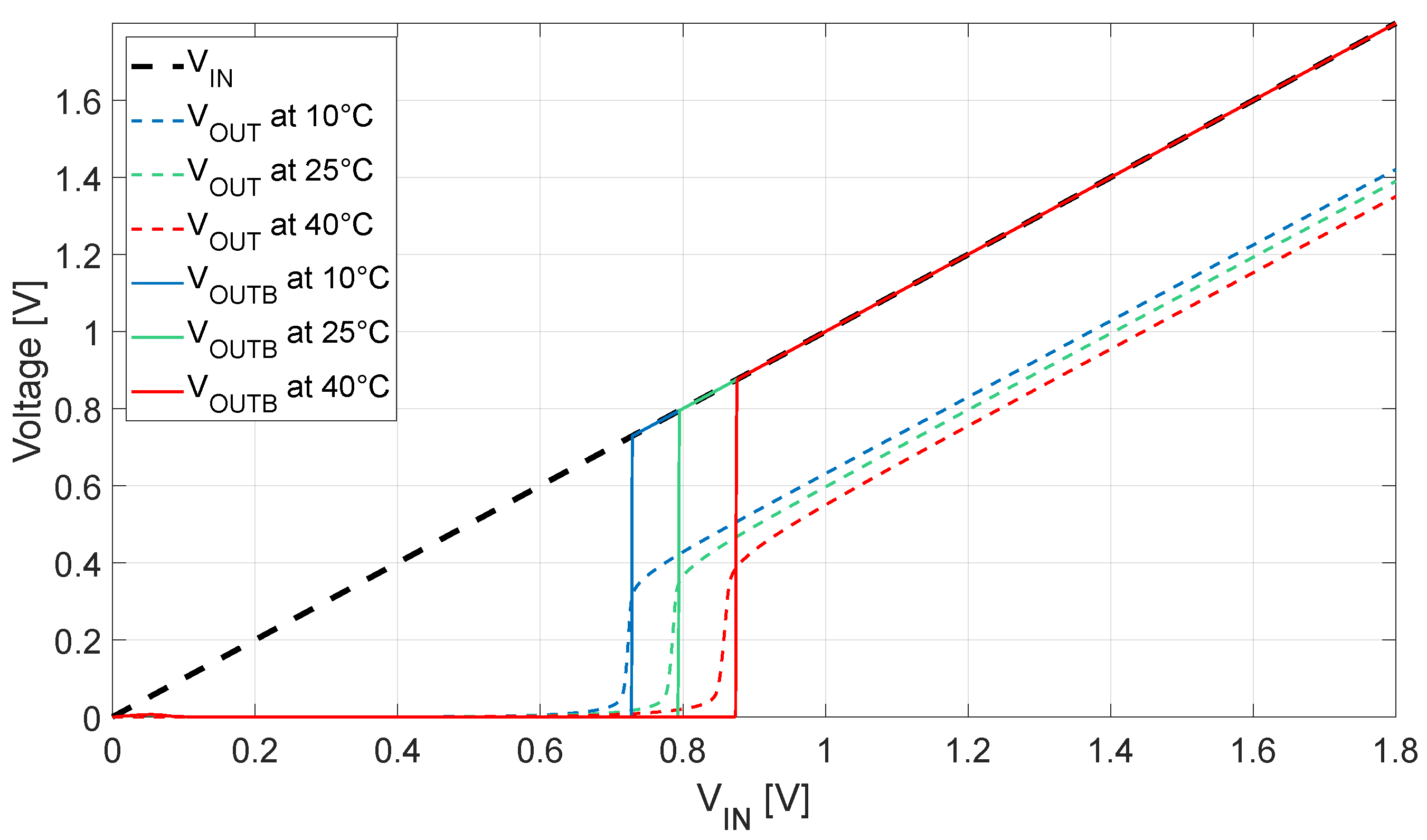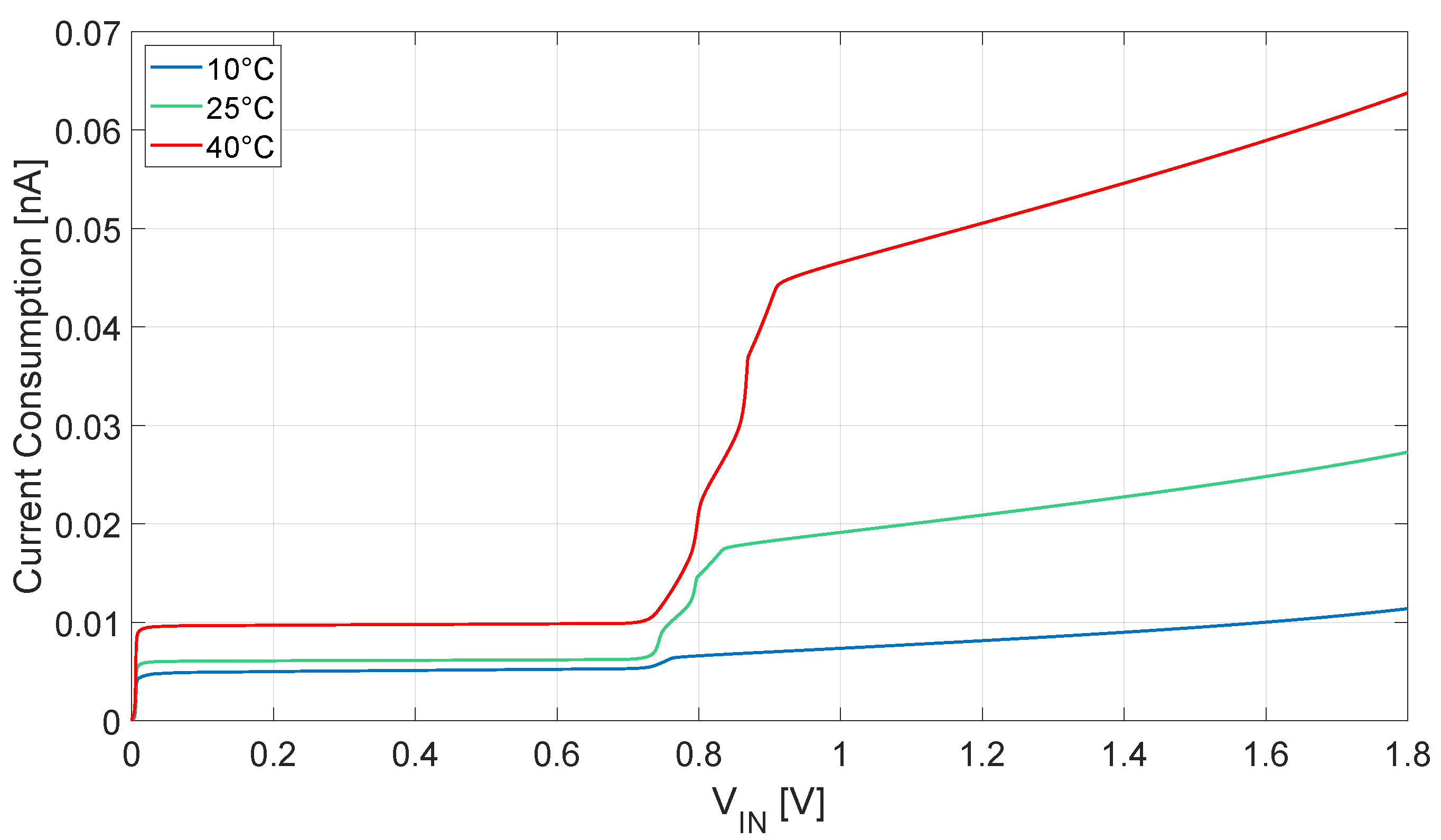 Figure 11. As expected, a difference in the trigger voltage is found at different temperatures: as the variation is ±100 mV between 10 °C and 40 °C, this is in line with the state of the art and acceptable for energy-harvesting-powered applications targeting room temperature use. It can be noticed that the current consumption, directly determined by the leakage of the transistors with zero