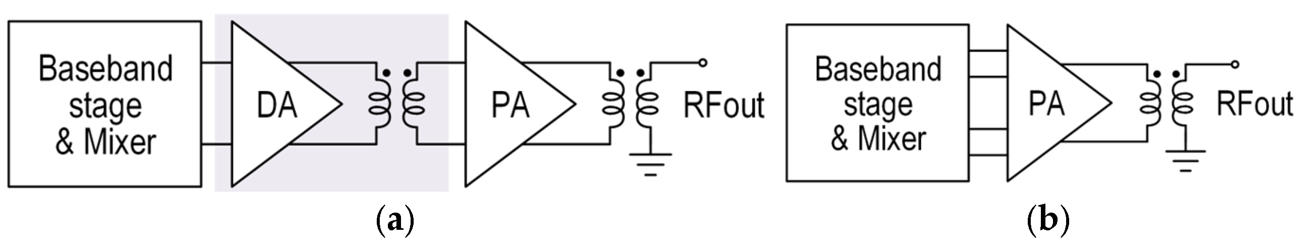 Figure 1a) and the proposed design. While removing the driver amplifier improves compactness, it introduces critical system-level trade-offs. Without the driver, the mixer must directly drive the PA’s large input capacitance, making the linearity sensitive to the switch resistance. Furthermore, the baseband amplifier is burdened with delivering a larger voltage swing to compensate for the reduced RF gain.
