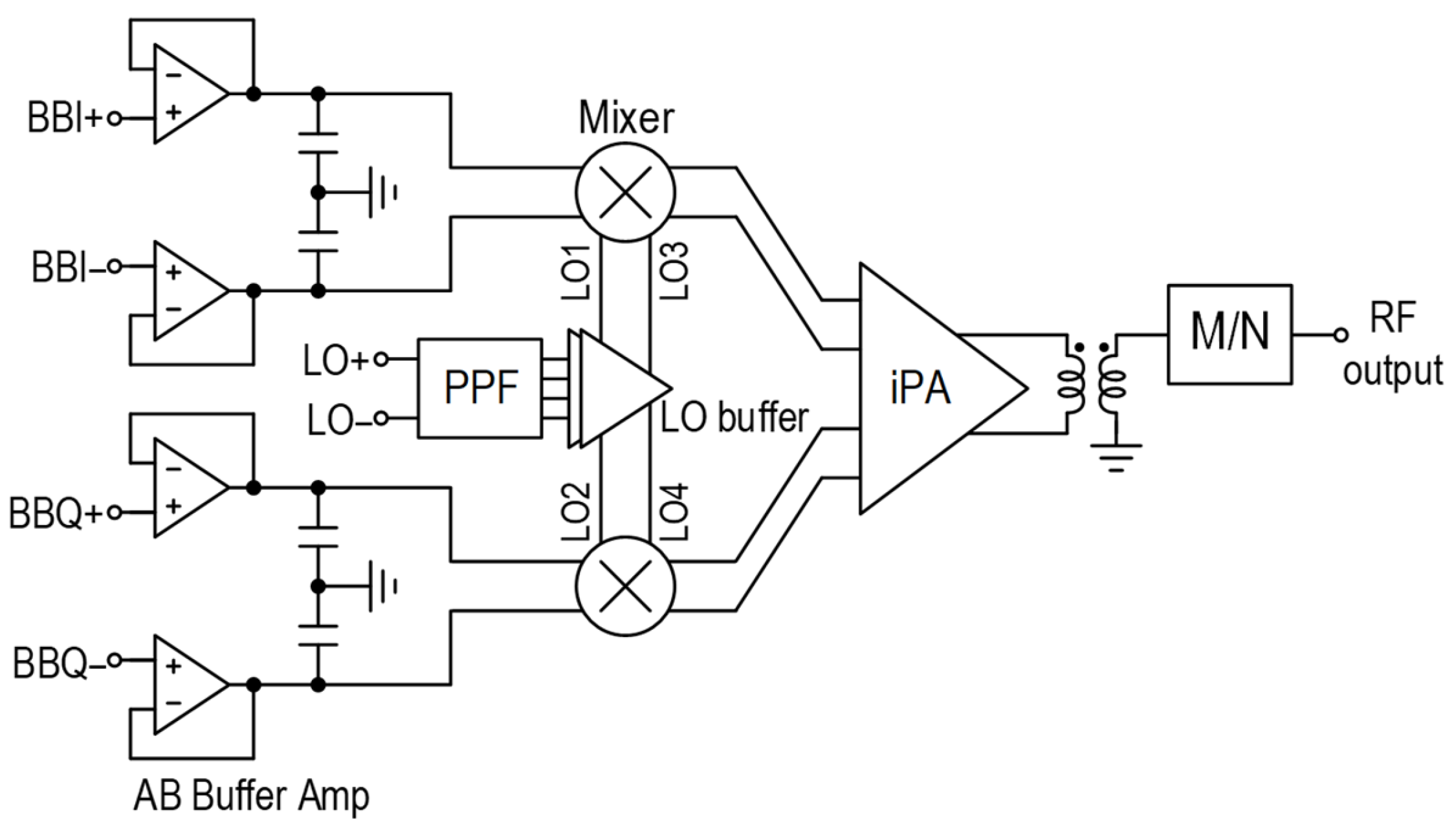 Figure 2 shows the overall block diagram of the proposed transmitter. The I/Q baseband signals are each provided as differential inputs. These signals are processed by unity gain Class-AB buffer amplifiers, which preserve the baseband signal while providing sufficient drivability for the following circuits. The Class-AB configuration at the output stage ensures the necessary current drive to handle the capacitive load without distorting the large-swing baseband signals.