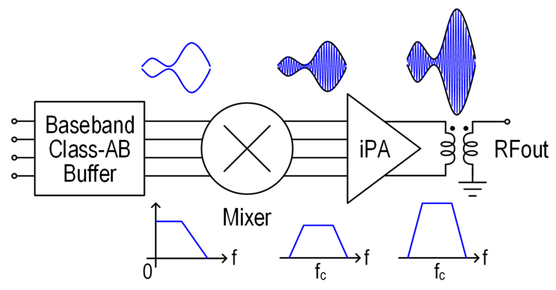 Figure 3 visually summarizes the overall signal path. The diagram illustrates the sequential evolution of the signal from the differential baseband inputs, through the up-mixer, and finally to the RF output of the PA.