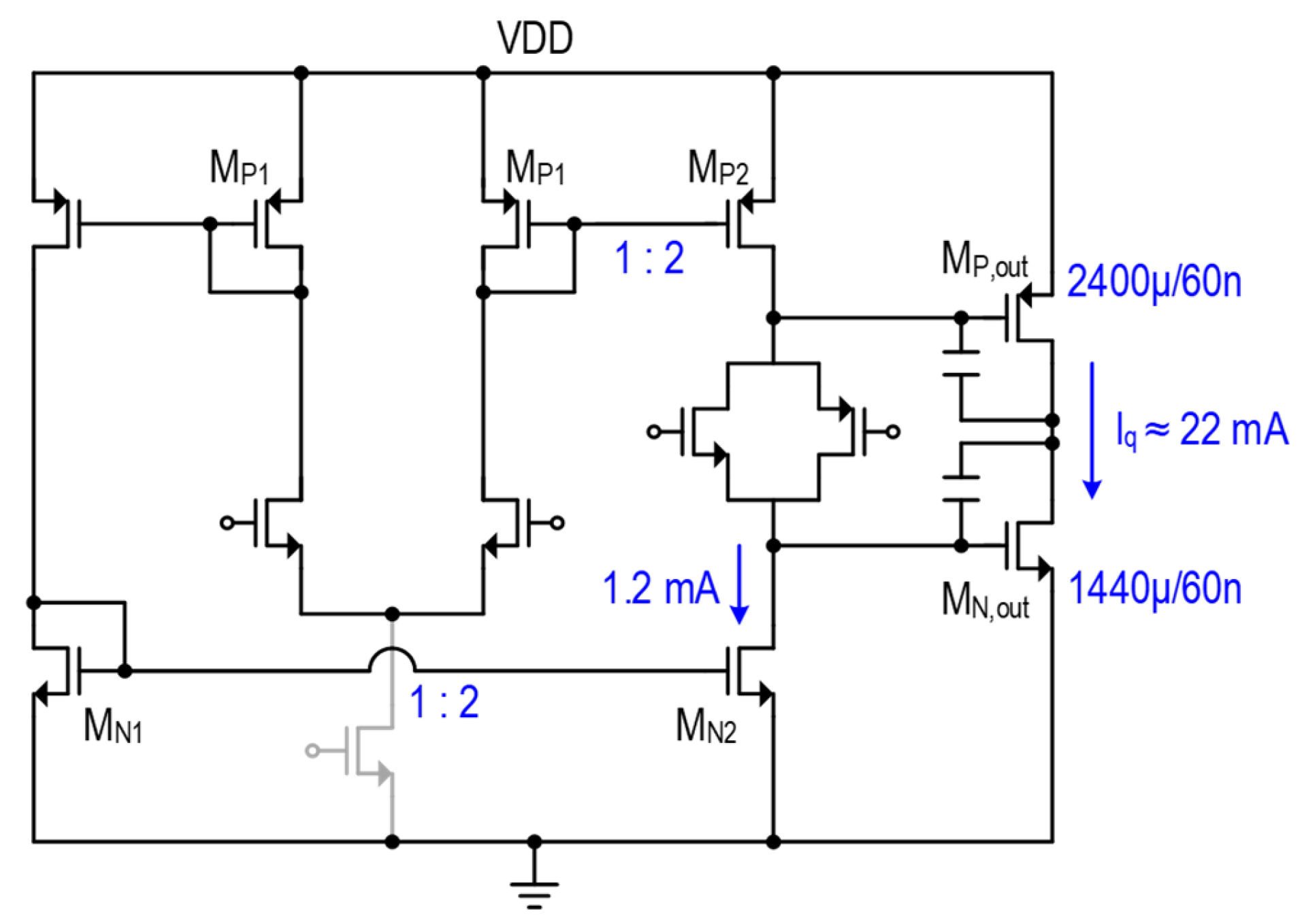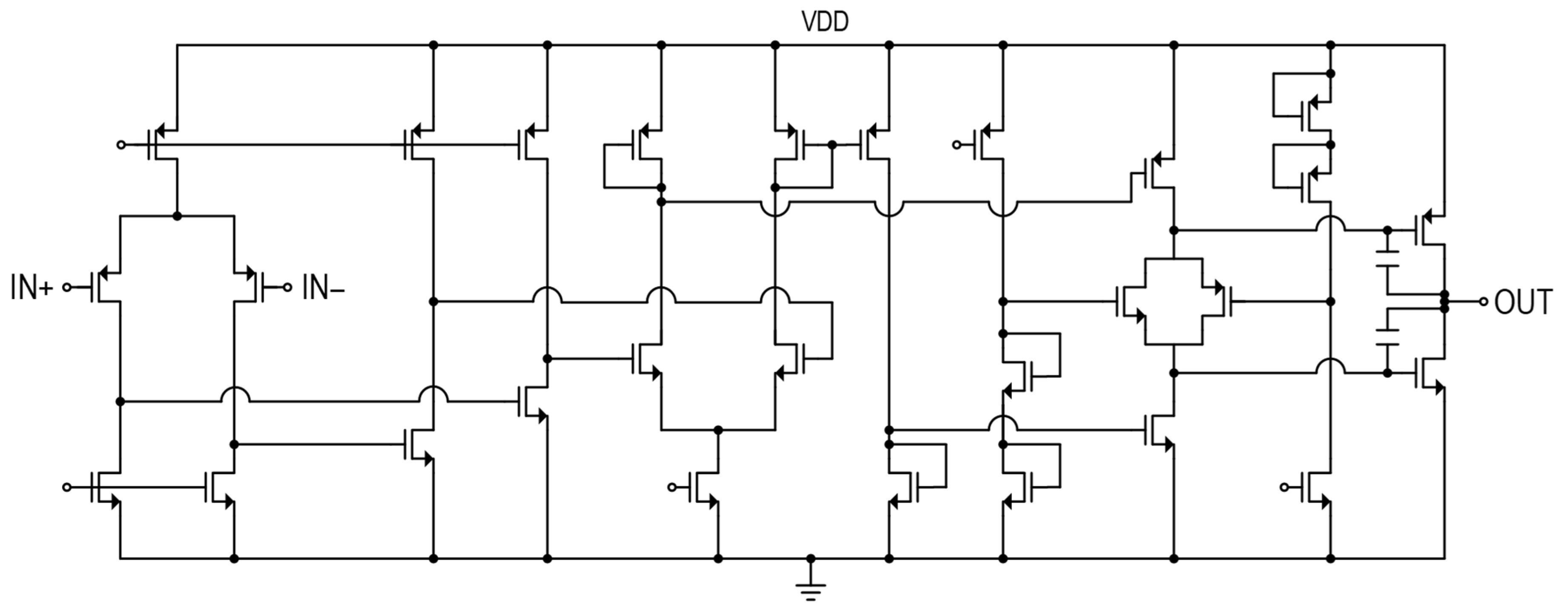Figure 5 shows that the Class-AB output stage enables rail-to-rail swing and high load-driving capability. Device sizing and bias points are optimized to maintain linear operation under large signal conditions while ensuring sufficient slew rate for the maximum expected baseband frequency content. The output stage transistors are sized at 2400 μ/60n (PMOS) and 1440 μ/60n (NMOS) to ensure sufficient drivability.