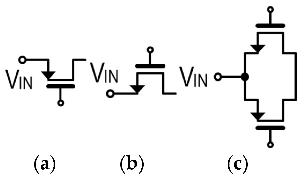 Passive mixer switch topologies: (a) PMOS-only; (b) NMOS-only; (c) Transmission-gate.