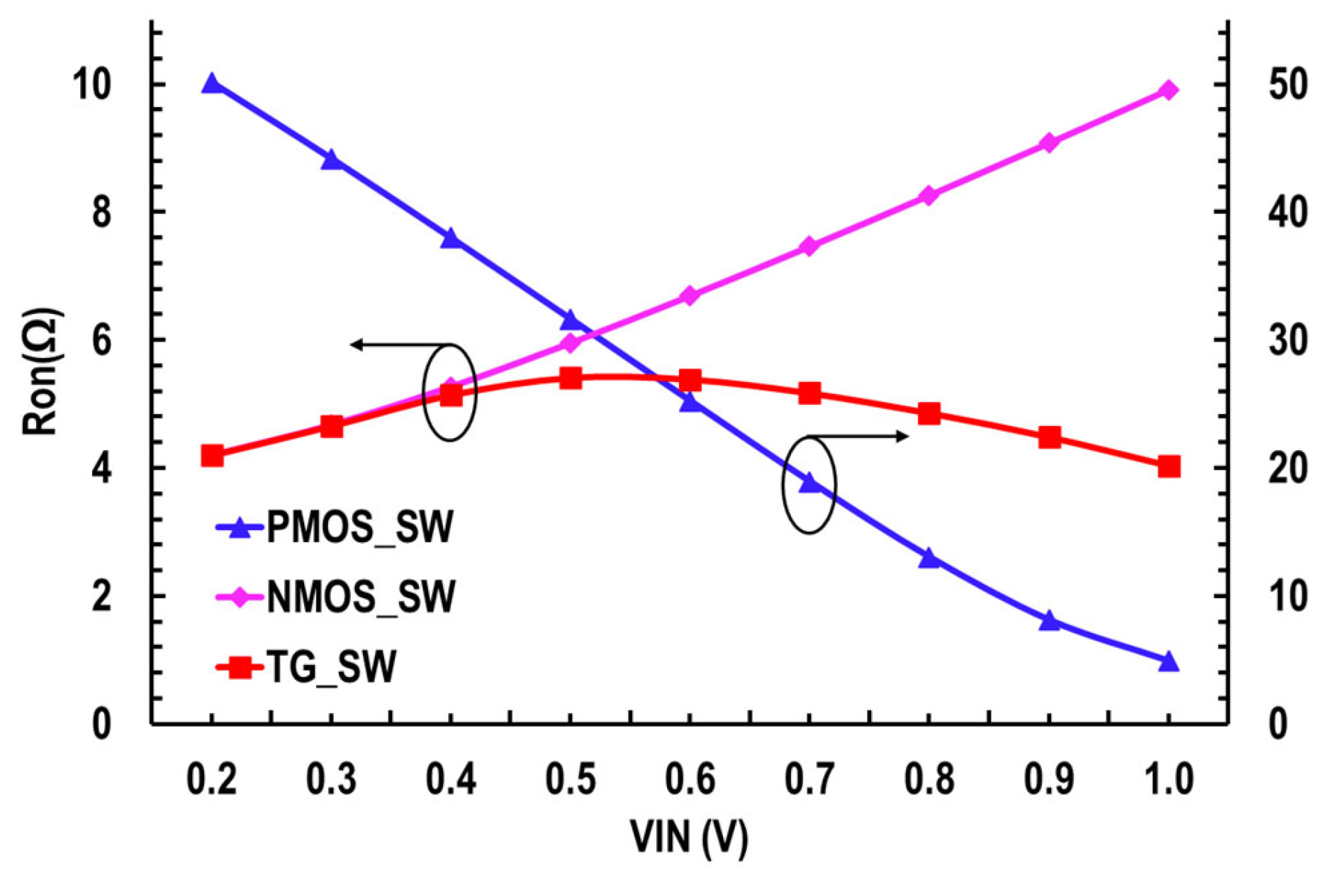 Figure 7 as (a) PMOS-only, (b) NMOS-only, and (c) Transmission-gate—by sweeping the BB level and extracting Ron.