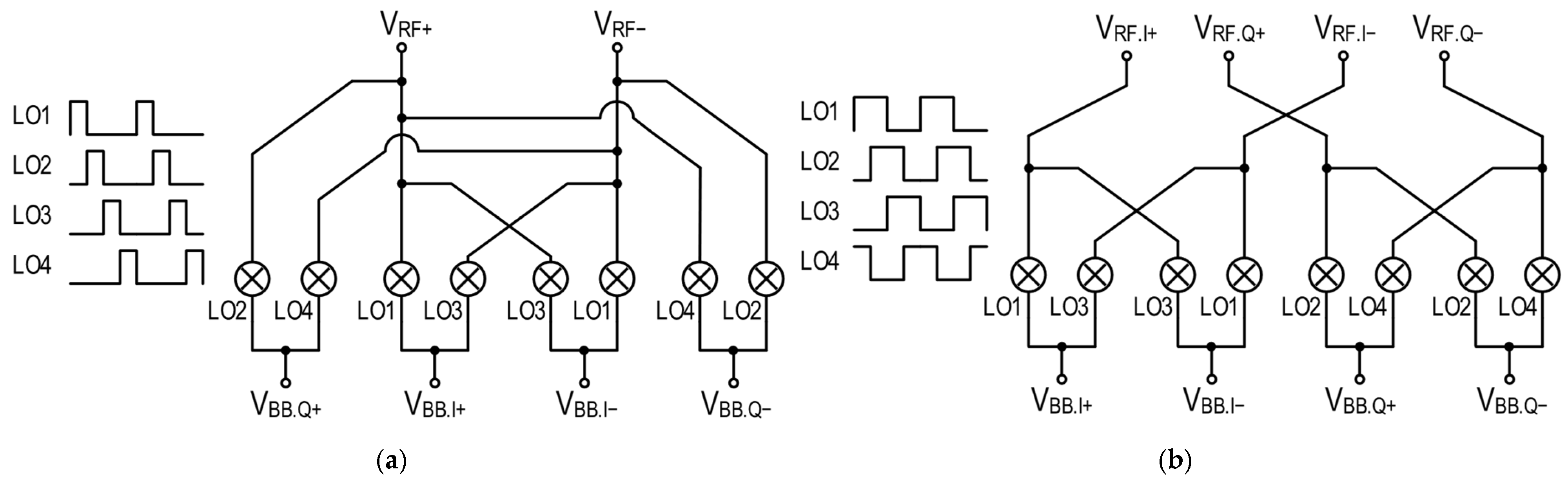- Mirzaei, A.; Murphy, D.; Darabi, H. Analysis of Direct-Conversion IQ Transmitters with 25% Duty-Cycle Passive Mixers. IEEE Trans. Circuits Syst. I Regul. Pap. 2011, 58, 2318–2331. [Google Scholar] [CrossRef]