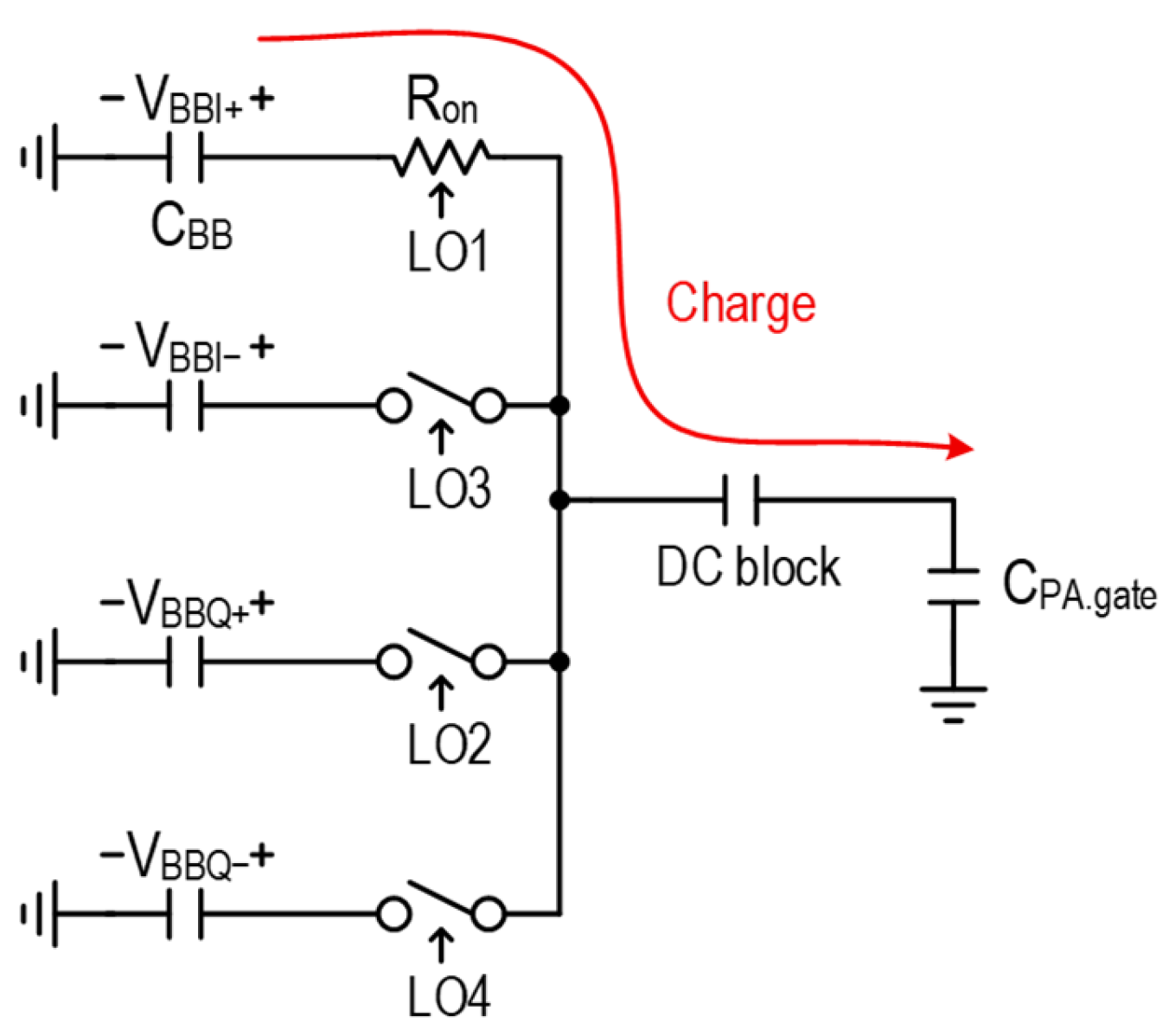 Under an I/Q-shared path, sequentially sampling I and Q onto a single PA gate can lead to residual charge on the gate node, causing memory-induced degradation of linearity metrics such as EVM. Increasing the baseband shunt capacitor can alleviate this (by making ), but an on-chip capacitor incurs substantial area and shifts the BB output pole to lower frequency, destabilizing the baseband amplifier.