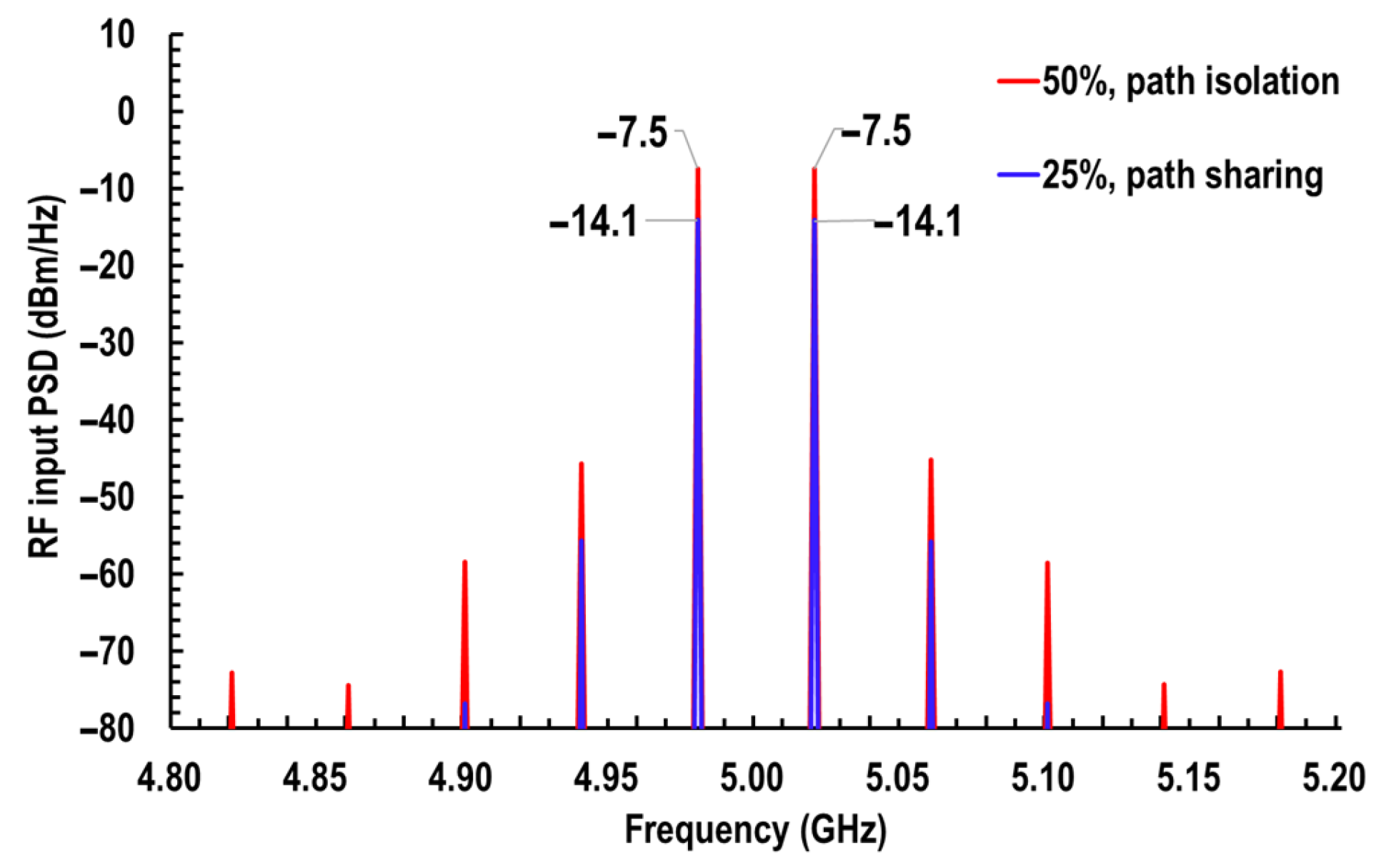 Figure 11 shows that the 50% case exhibits ~6.5 dB higher input power at the PA interface.