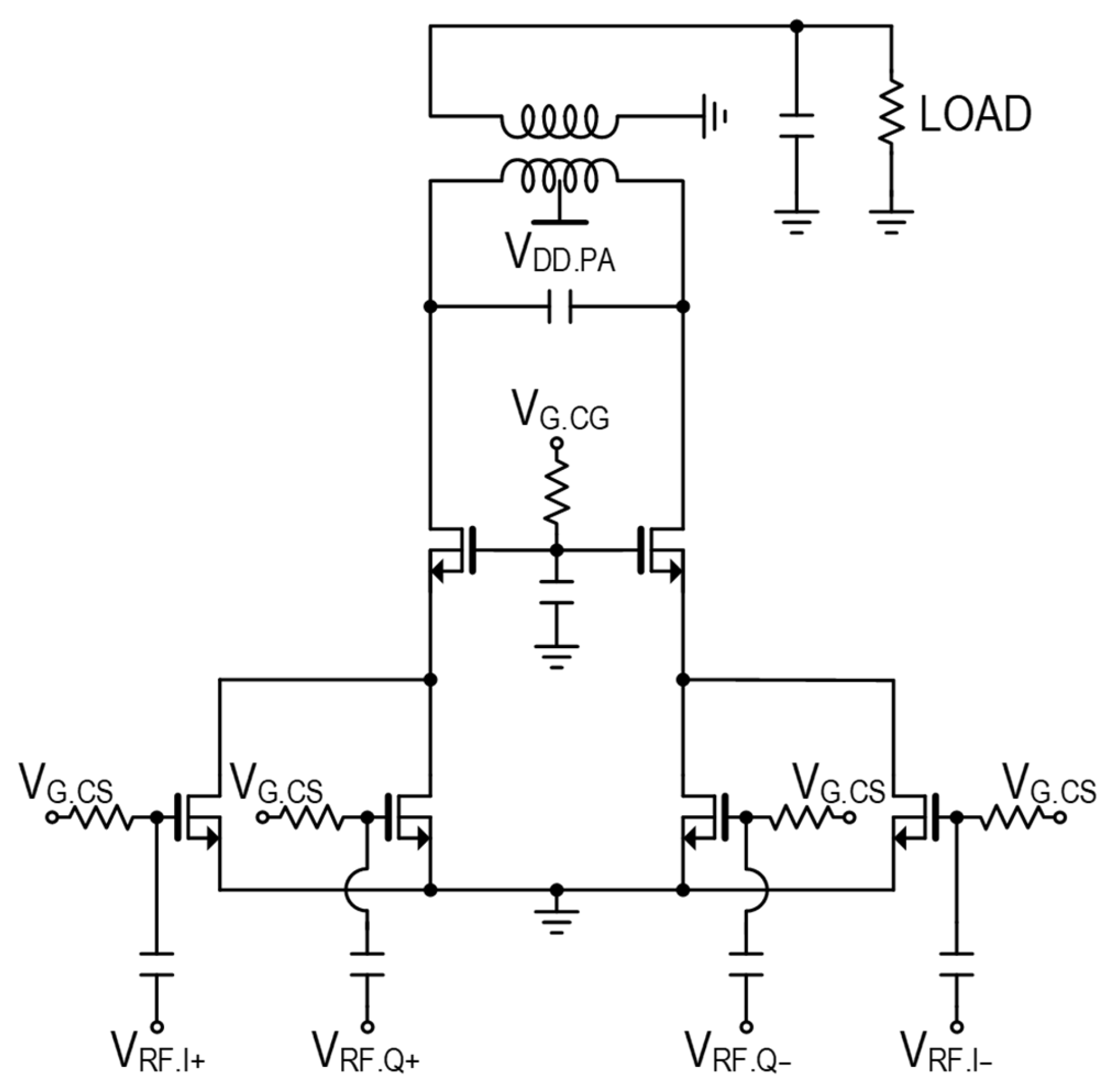 Accordingly, the cascode PA is implemented with I/Q isolated inputs and current combining at drain.