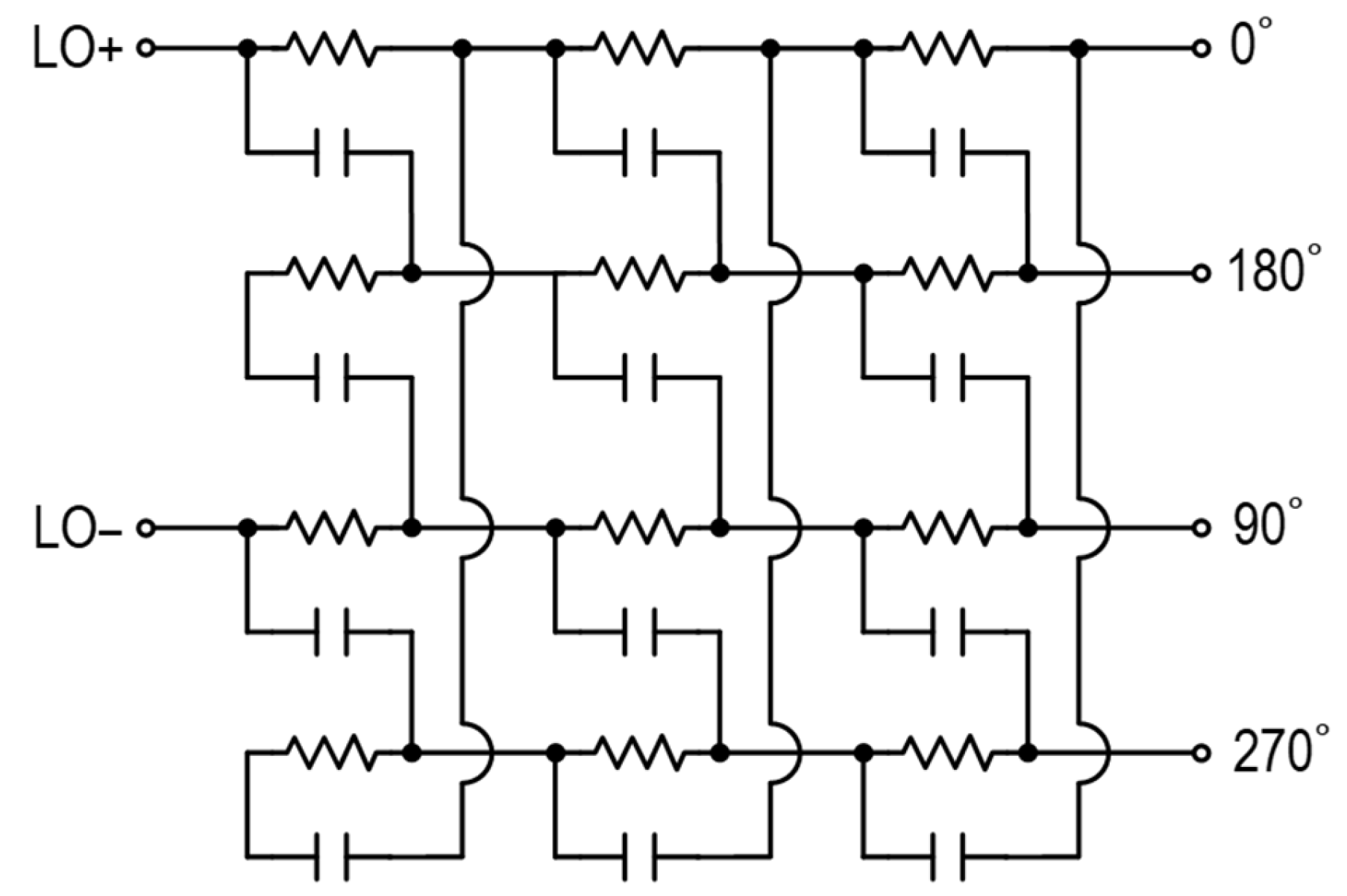 Figure 13) followed by LO buffer amplifiers. The PPF converts the differential 5–5.5 GHz LO input into four quadrature-phase signals (0°, 90°, 180°, 270°) with a 50% duty cycle. The PPF is designed for constant-phase operation, ensuring that the 90° phase difference between I and Q paths is maintained consistently across the intended operating bandwidth [