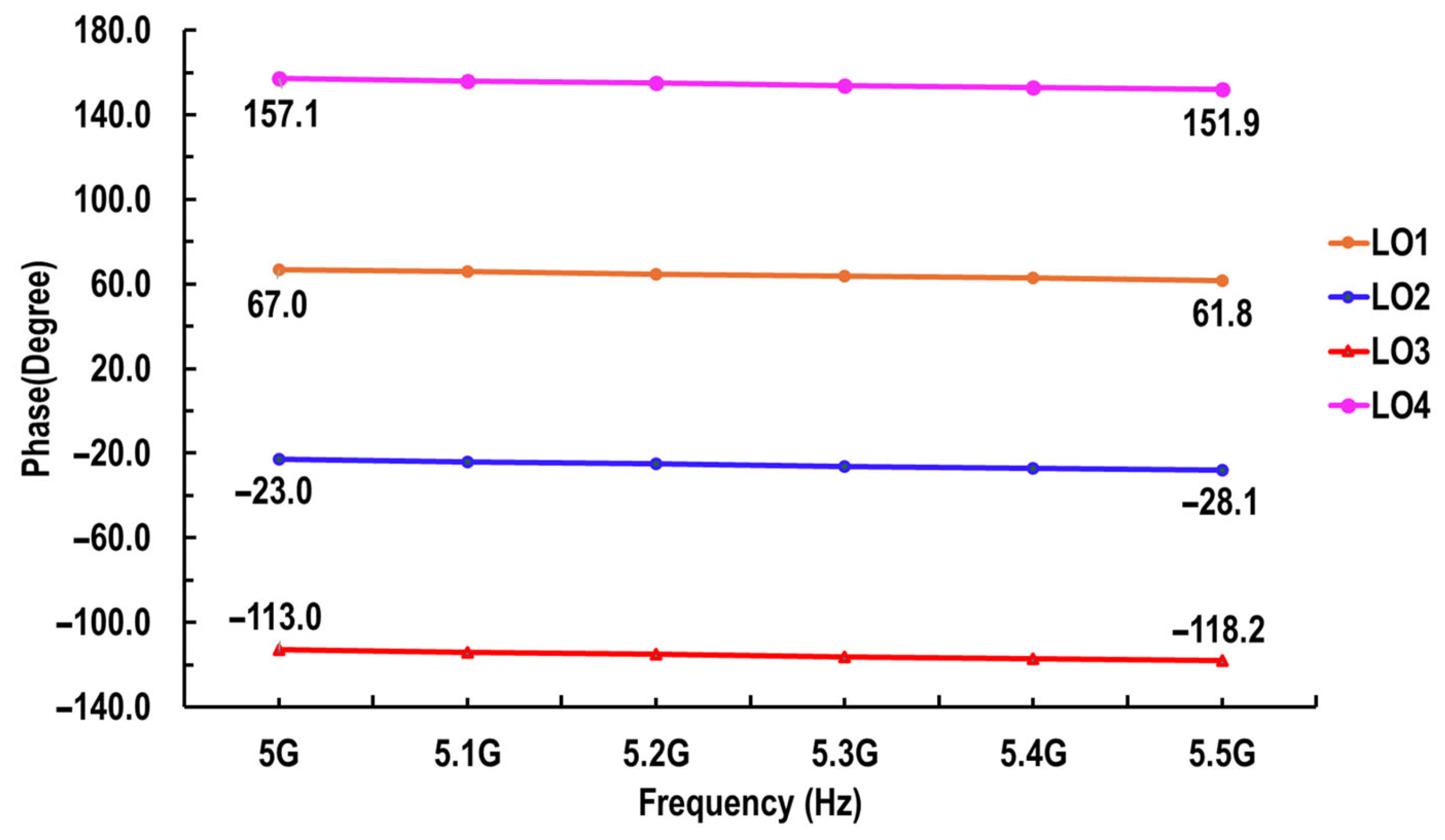 Figure 14, simulations confirm that the quadrature phase mismatch remains below 0.2° (deviation from the ideal 90° spacing) and amplitude variation within 3% (535–548 mV) across 5–5.5 GHz, ensuring robust I/Q orthogonality.