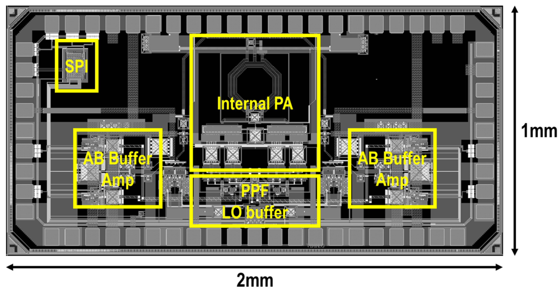 The differential structure driven by in/out-phase LO signals cancels the 5 GHz LO feedthrough at the PA input and layout symmetry is strictly maintained, resulting in LO leakage levels lower than inter-modulated products in two-tone test results.
