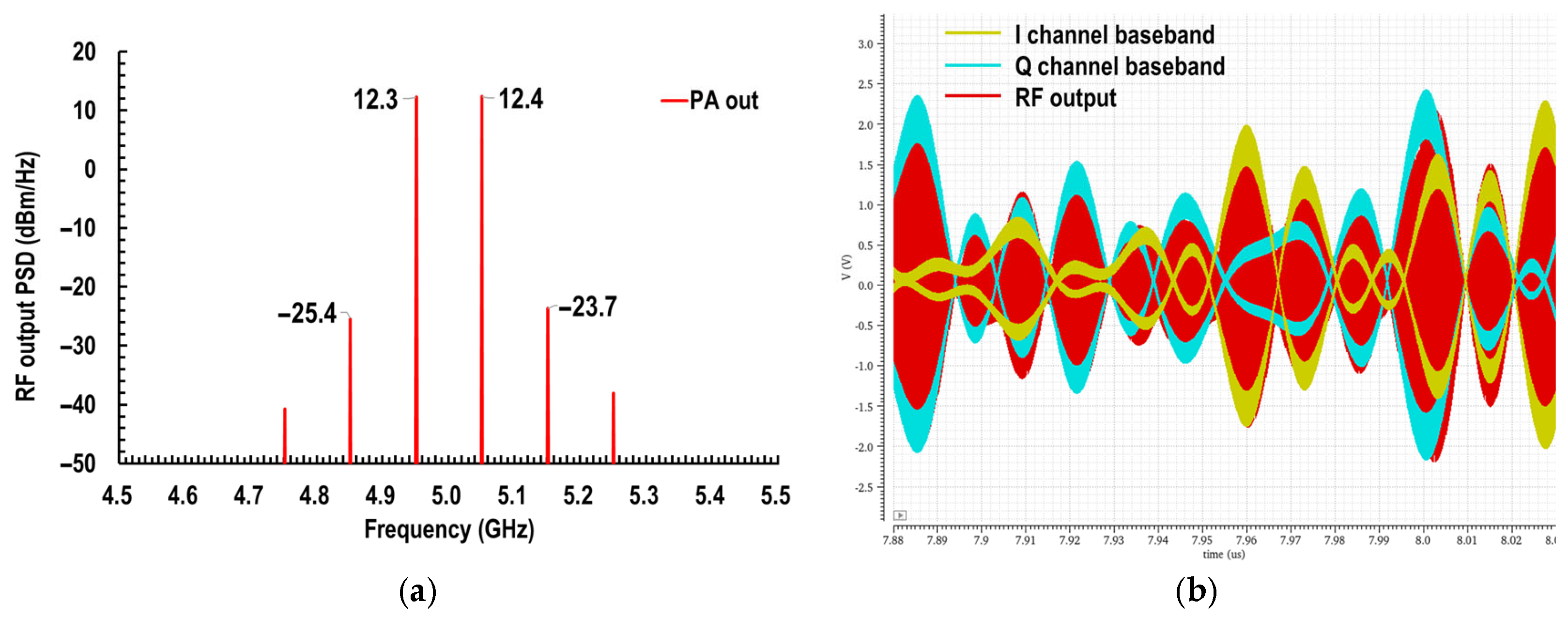 Figure 17), providing a linearity headroom of over 12 dB against the specification. Also, we analyzed the signal linearity at the PA input node to verify the performance of the driverless interface. The simulation confirms that the signal delivered from the mixer to the PA maintains a low IMD3 of −43.3 dBc at the 9 dB back-off power level with a 100 MHz spaced two-tone test, indicating that the preceding Class-AB buffer and TG mixer introduce negligible distortion. The total power consumption of the transmitter is summarized as follows: the four-channel Class-AB baseband buffer amplifiers consume about 100 mW, while the LO generation and buffering stage consume approximately 150 mW. In terms of efficiency, the standalone PA achieves a peak Power-Added Efficiency (PAE) of 21–21.7%.