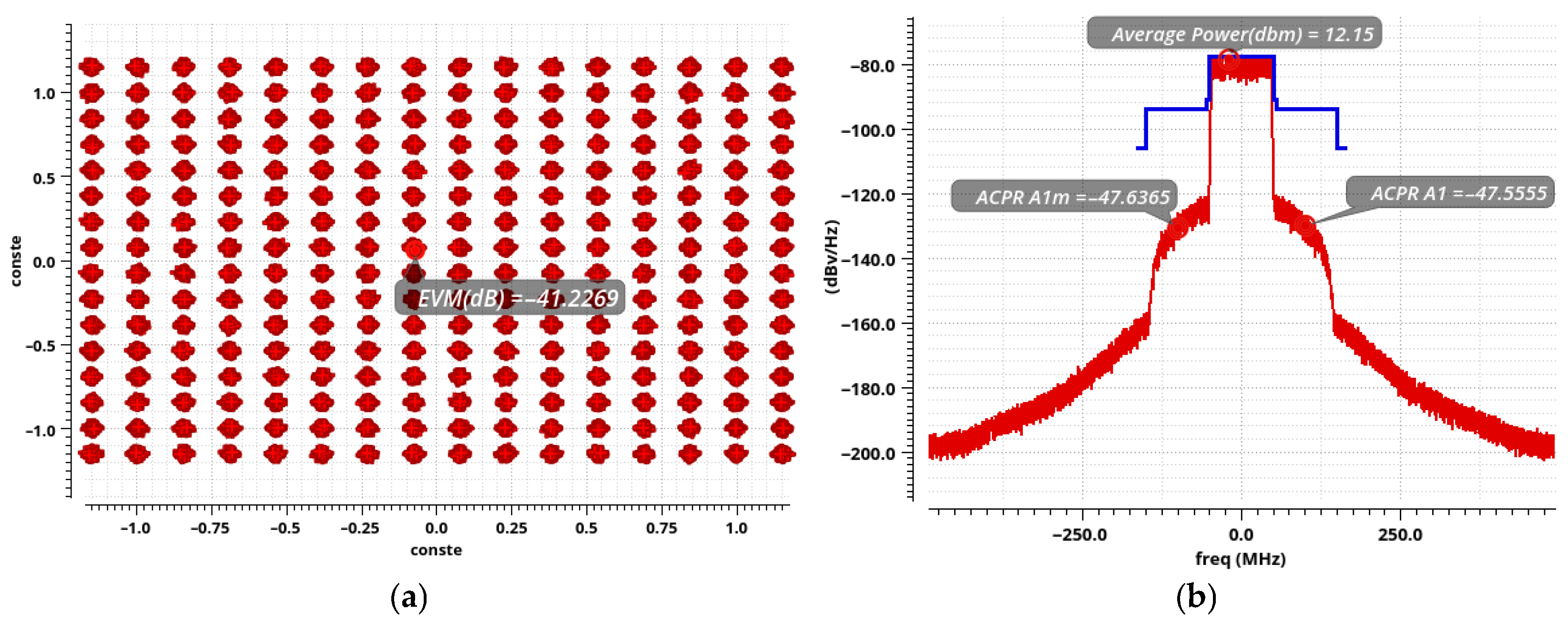 To further validate the linearity compliance for 5G NR 256-QAM specifications (EVM < −29.1 dB), we conducted a cross-verification analysis. The standalone PA envelope simulation with the target modulated signal exhibits an EVM of −41.2 dB at 12 dBm of average output power (