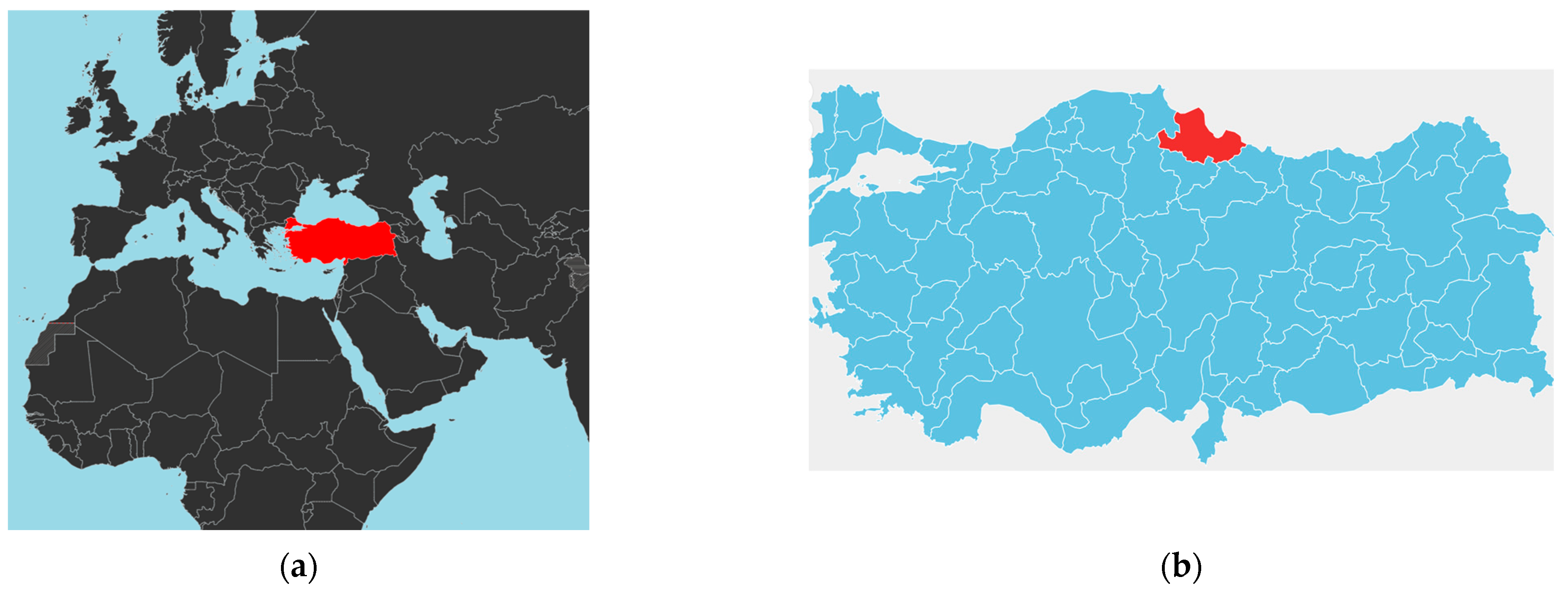 - Harita Genel Müdürlüğü. İl ve İlçe Yüz Ölçümleri. Available online: https://www.harita.gov.tr/il-ve-ilce-yuzolcumleri (accessed on 29 November 2025).
