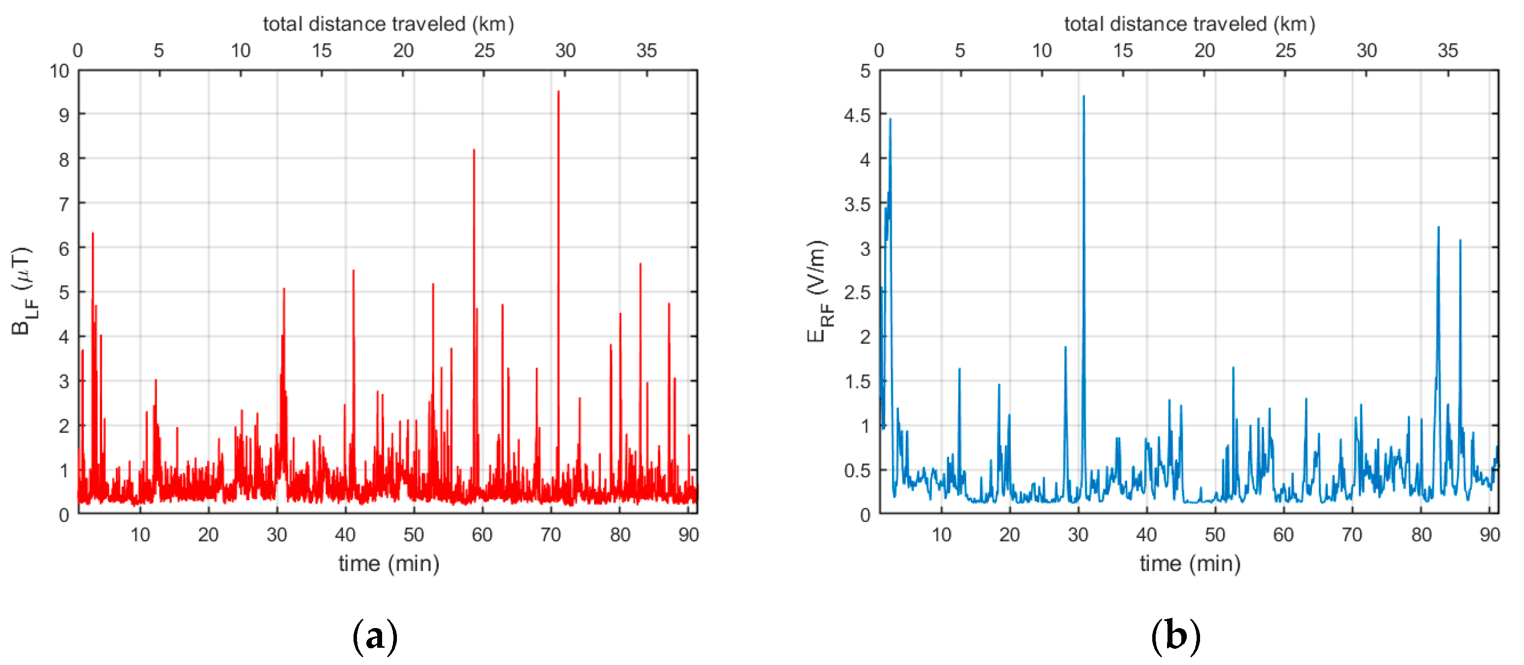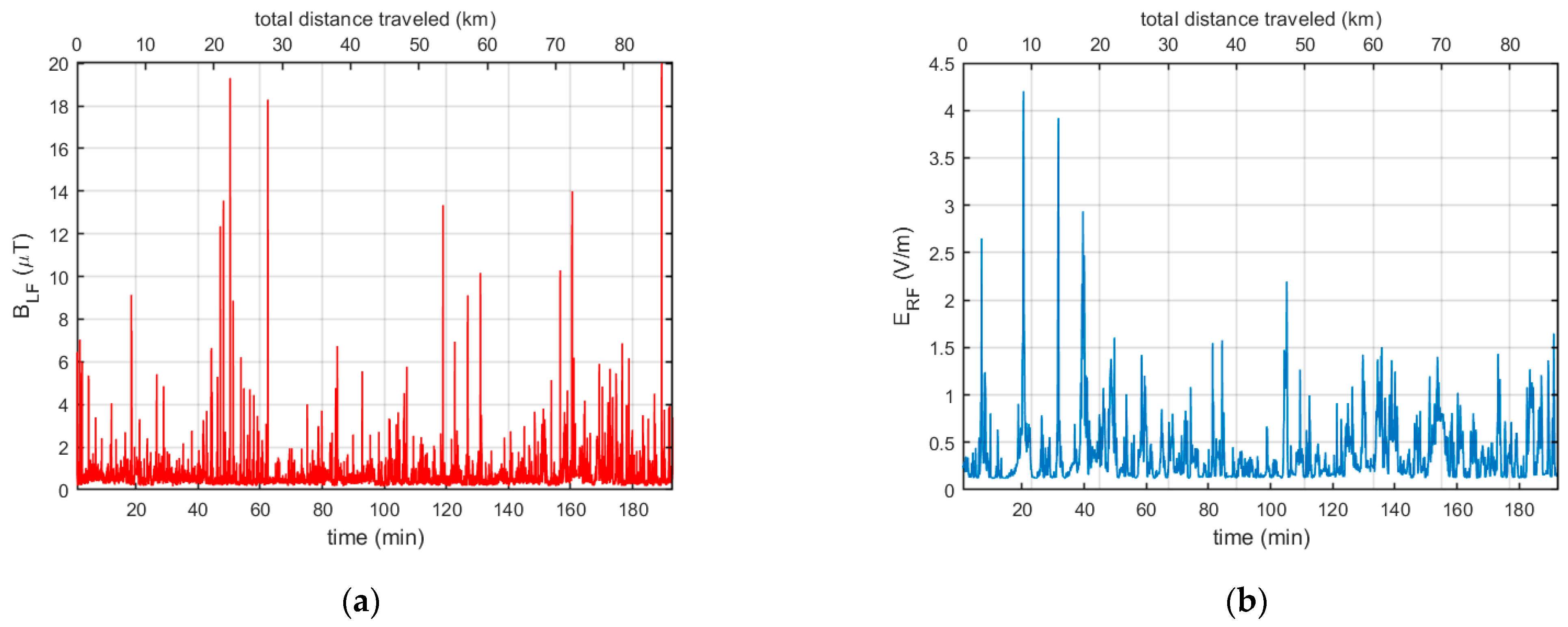 - Atanasova, G.L.; Atanasov, B.N.; Atanasov, N.T. Assessment of electromagnetic field exposure on European roads: A comprehensive in situ measurement campaign. Sensors 2023, 23, 6050. [Google Scholar] [CrossRef]