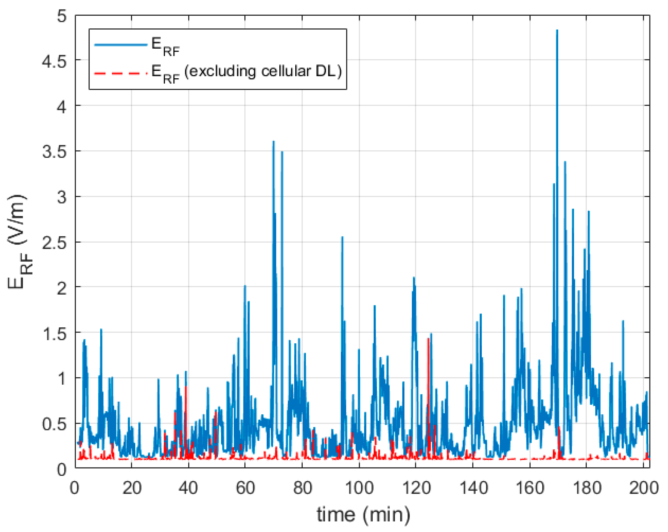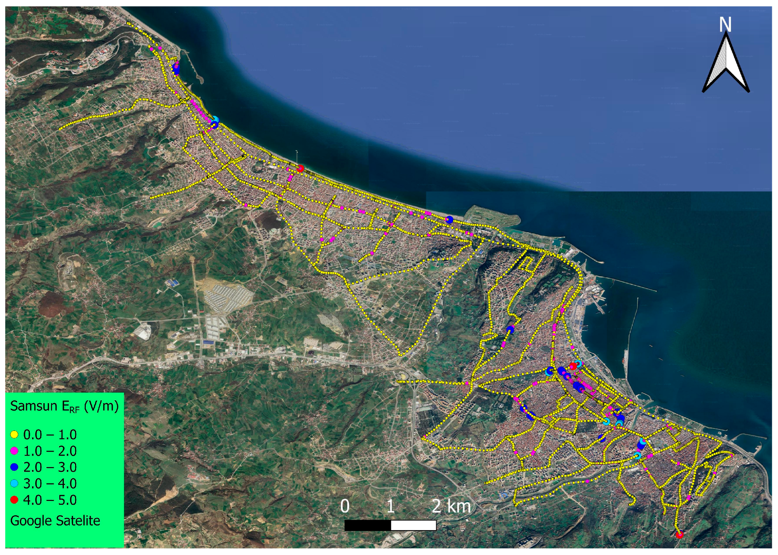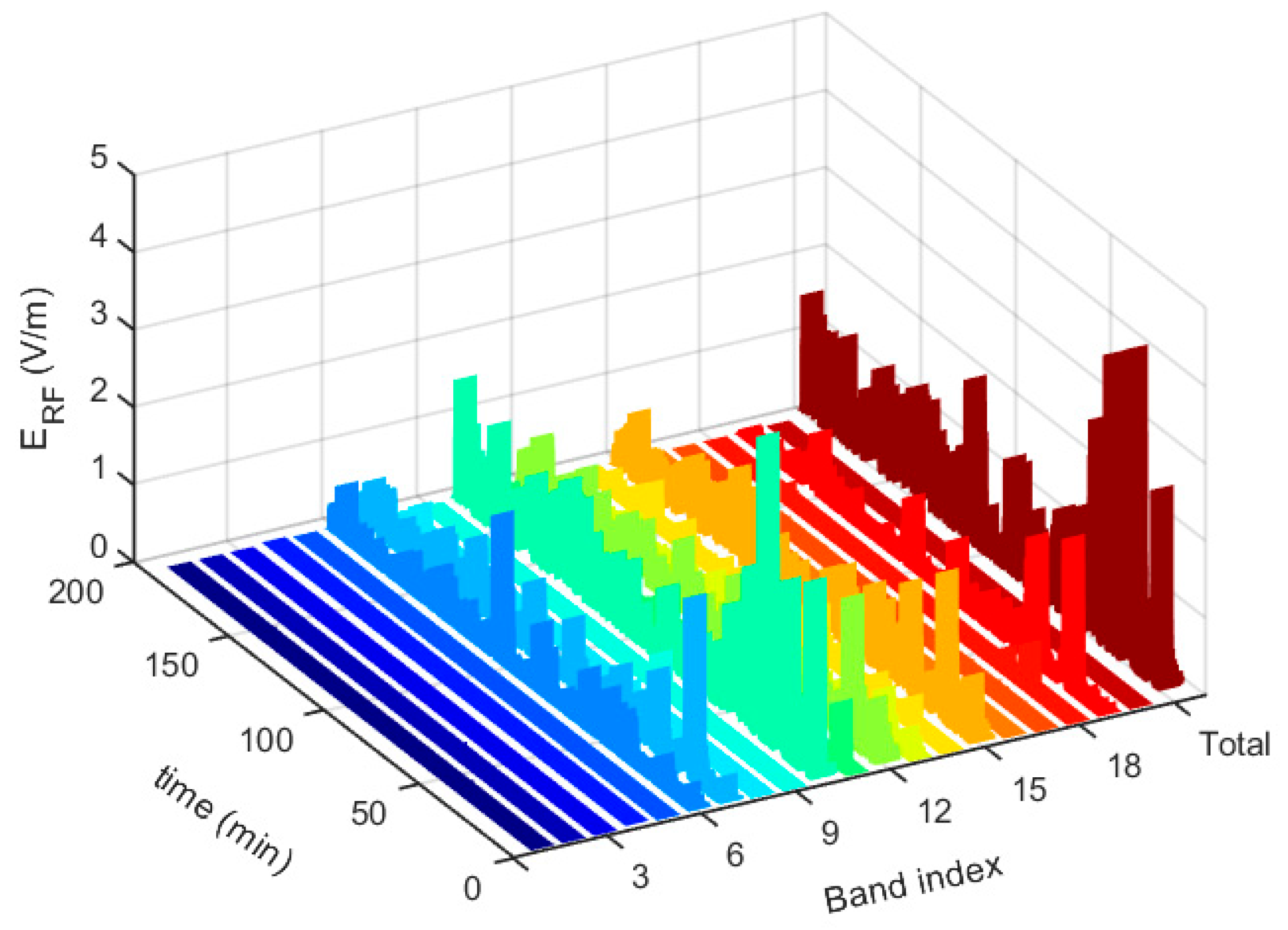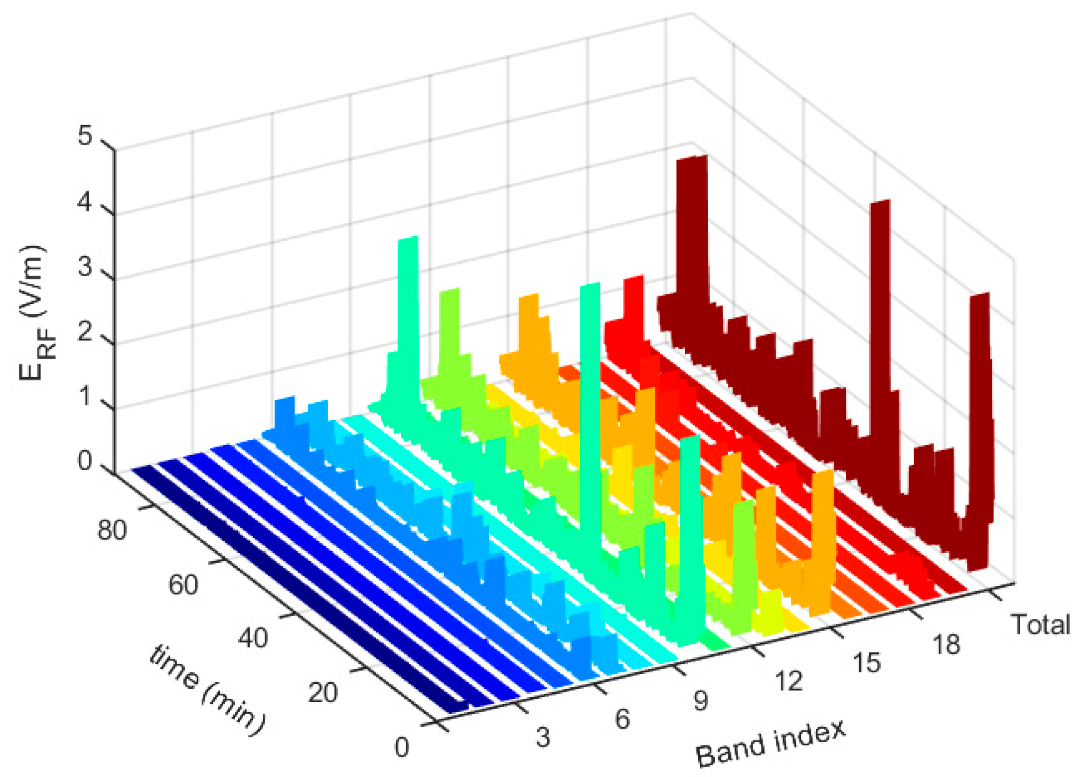 - Kurnaz, C.; Mutlu, M. Comprehensive radiofrequency electromagnetic field measurements and assessments: A city center example. Environ. Monit. Assess. 2020, 192, 334. [Google Scholar] [CrossRef] [PubMed]