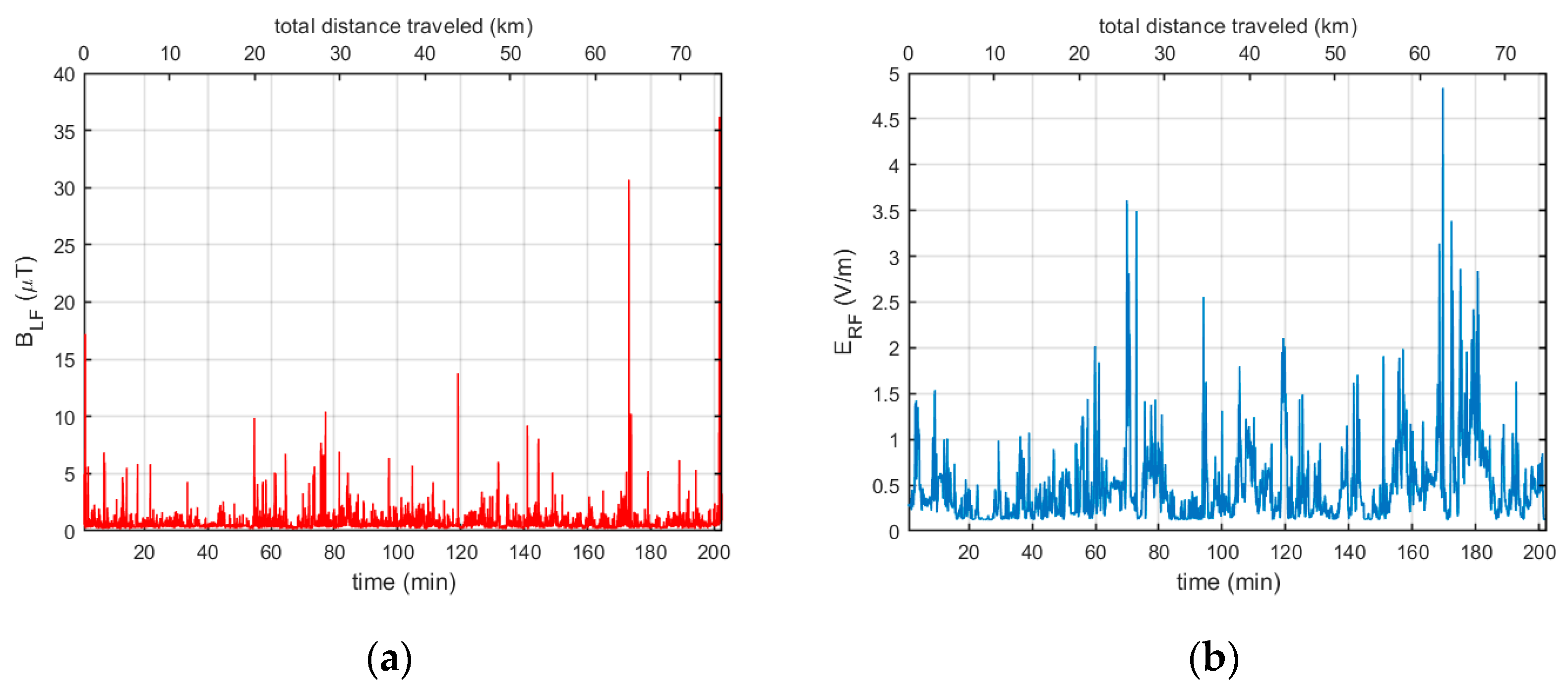 - Albayrak, Z.E.; Kurnaz, C.; Karadağ, T.; Cheema, A.A. Comprehensive analysis of magnetic flux density and RF–EMF exposure in electric buses: A case study from Samsun, Turkey. Sensors 2024, 24, 5634. [Google Scholar] [CrossRef]