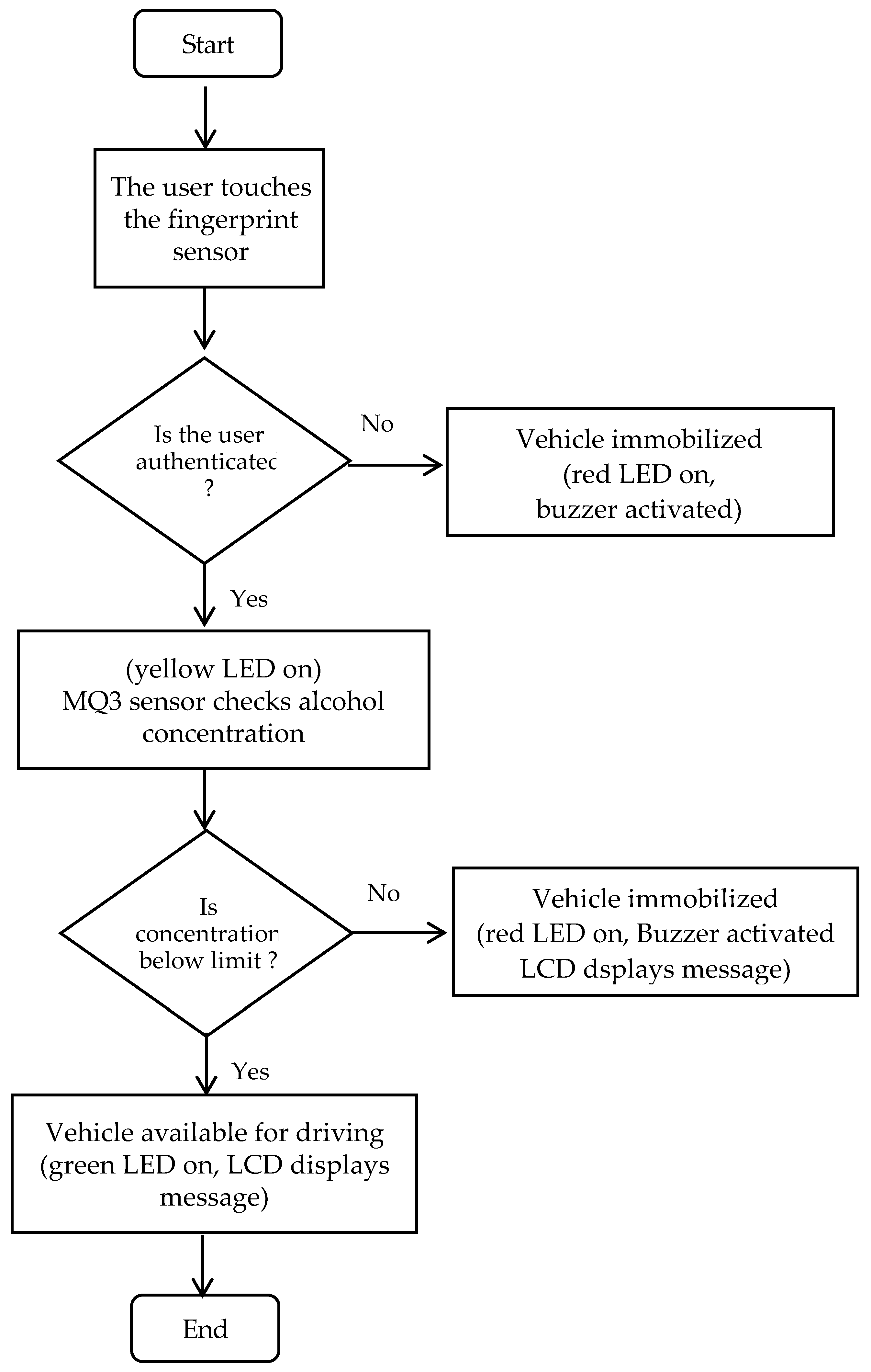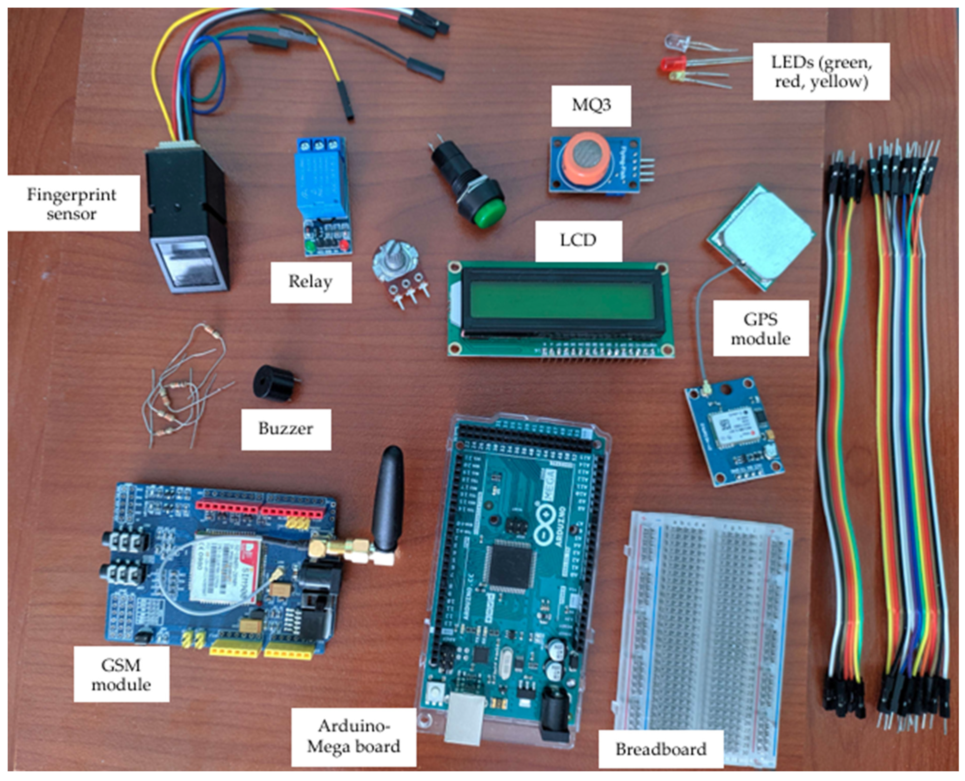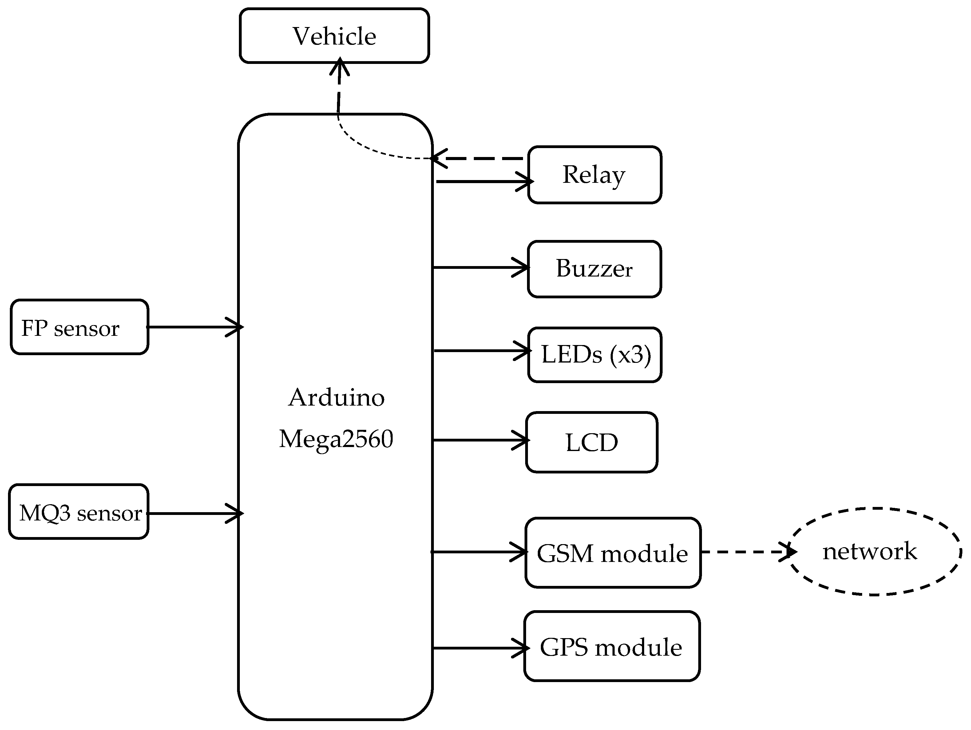 - Ahmad, I.; Suhaimi, M.; Yusri, N. Development of an alcohol sensor/detector with engine locking system for accident prevention. In Proceedings of the American Institute of Physics AIP, Melbourne, Australia, 4–6 December 2019. [Google Scholar]